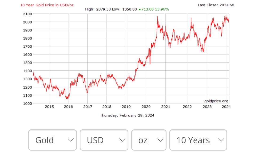 Also look at Gold's 10 year price chart... It has also been bumpy ride over there