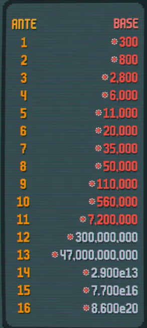 You technically win a run at ante 8 and the final "boss" usually requires around 100,000 chips. You then have the option to keep going into "endless mode", and it gets a little bonkers and starts getting into the millions, billions, and quintillions!