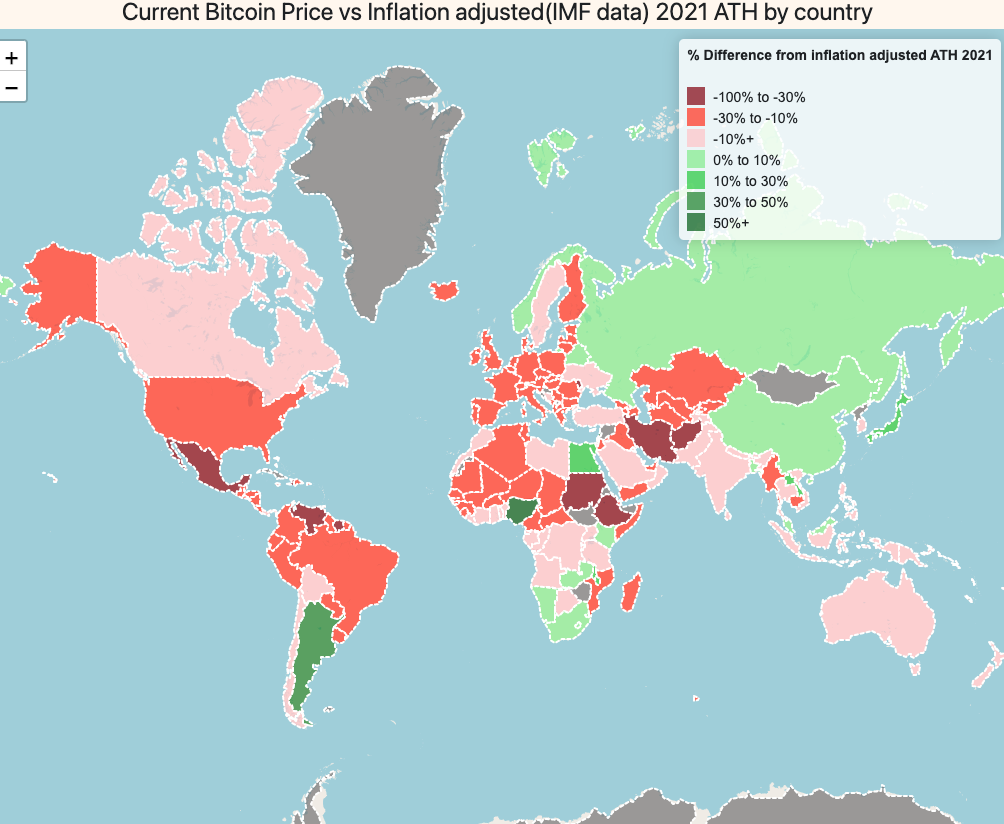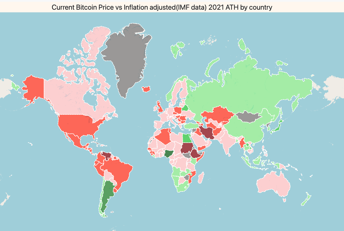 The BTC price vs BTC ATH 2021 world map is green everywhere. Based on feedback from the last post, it seems everyone prefers colorful maps, with a palette of red and green, rather than just green.