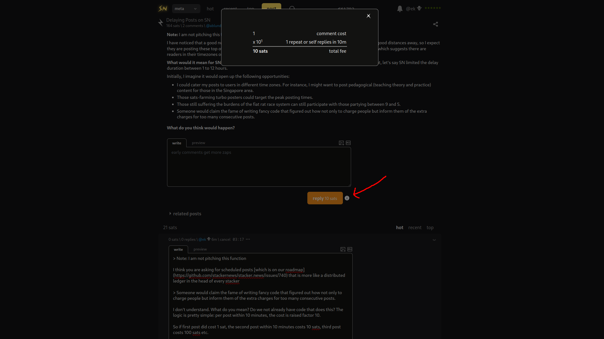 For example, after this reply, it shows that my next reply to this post will cost me 10 sats: