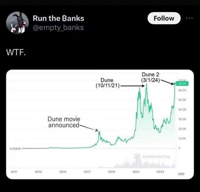 While Bitcoin briefly hit a new ATH just now, people are forgetting that Dune 2 is in theaters, and therefore the Bitcoin price is about to absolutely crash.