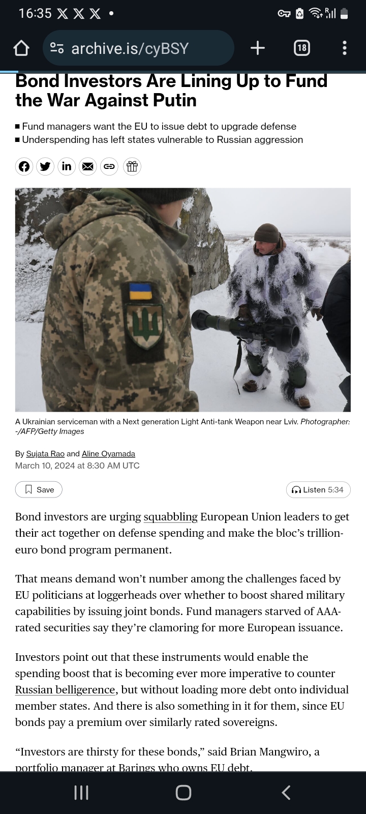 Bloomberg summarizes today in an article what I have been writing about for weeks: the EU is trying to introduce so-called war bonds with the help of an artificially created Putin fear, which would later create a whole new level of debt financing for the European Union as a bridge to Eurobonds. You have to know the background of the history of the European Union to understand that this is a big deal. The European Union was launched with the promise that fiscal policy would remain a matter for the nation states and that no joint liability for bankrupt states would be accepted. The Maastricht rules are now history, Europe will be able to introduce a new level of massive debt and put the European taxpayer behind the planned bonds as collateral. Anyone who still believes that the eurozone is a safe haven for capital and money is in for a surprise!