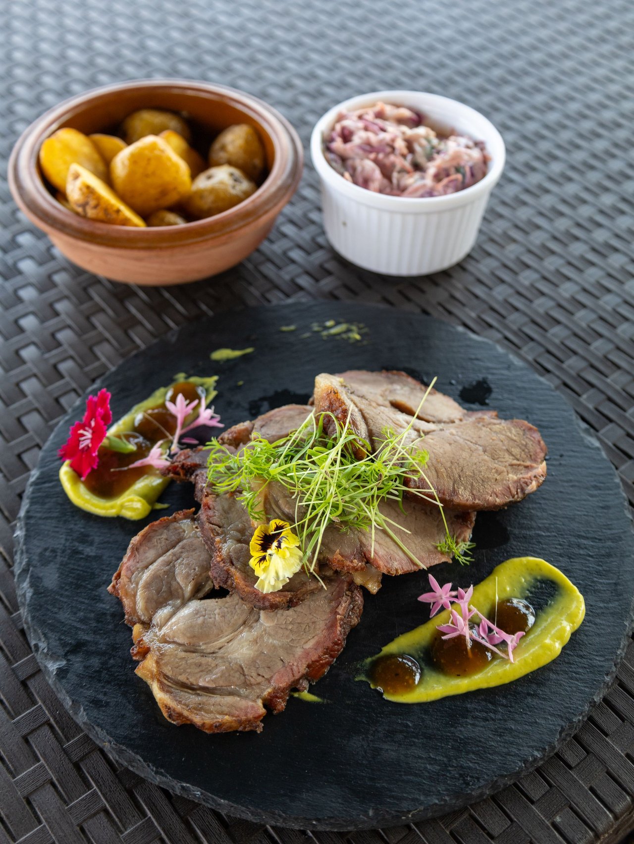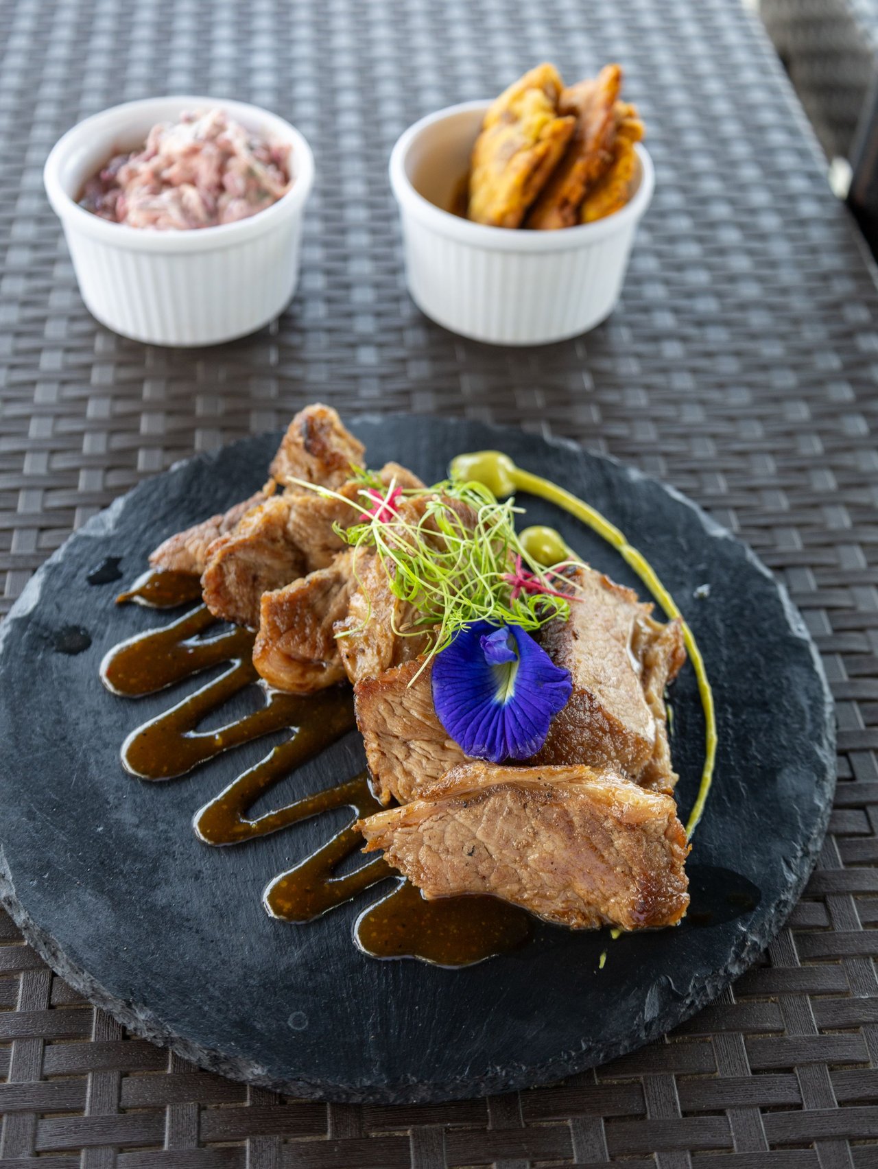 For lunch we ordered a steak) and grilled pork with salad and potatoes, and for drink we ordered passion fruit juice and mango juice.