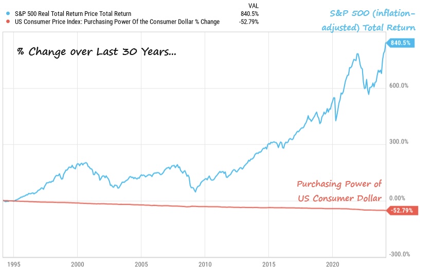 Over those 30 years , the S&P 500 has gained 840% (7.8% per year) after adjusting for inflation. Oh and Bitcoin has gone to the moon!