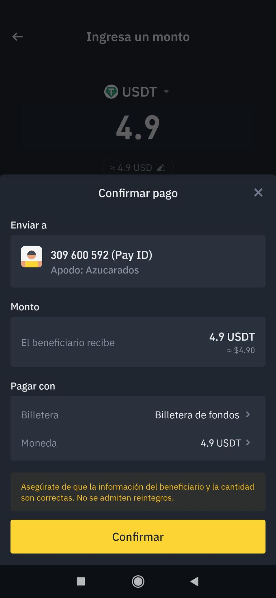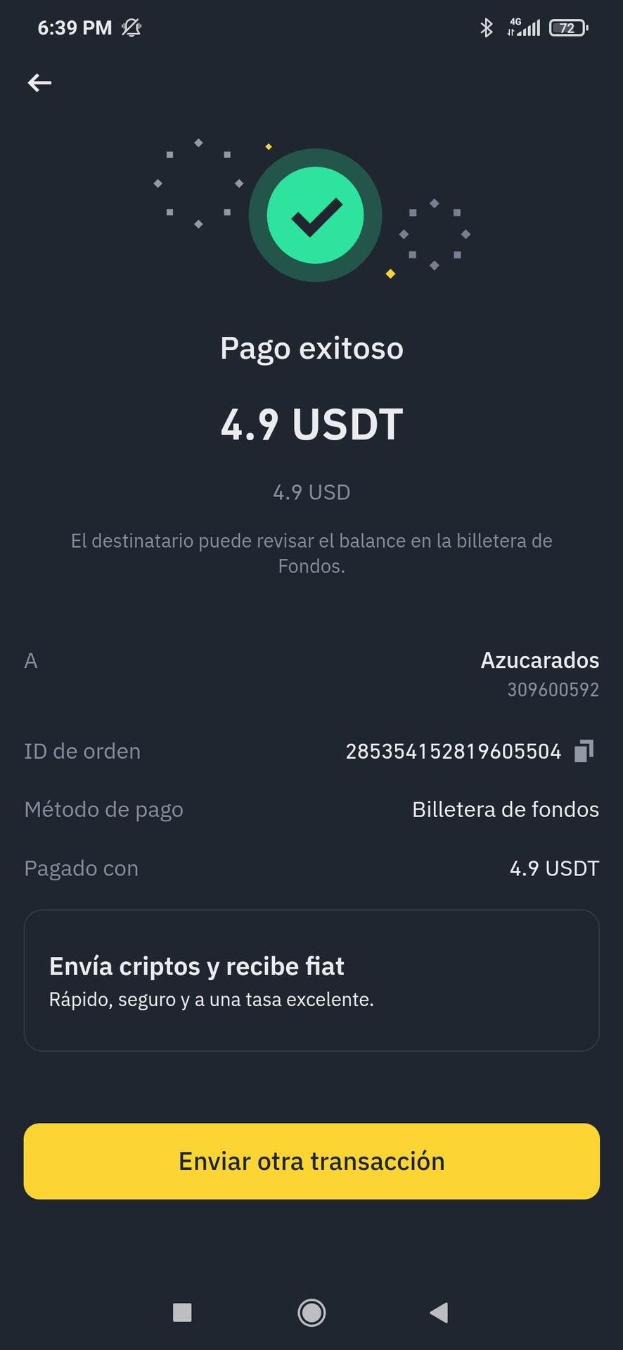 I also bought a couple other things and payed with USDT, here is the capture of the payment trought binance