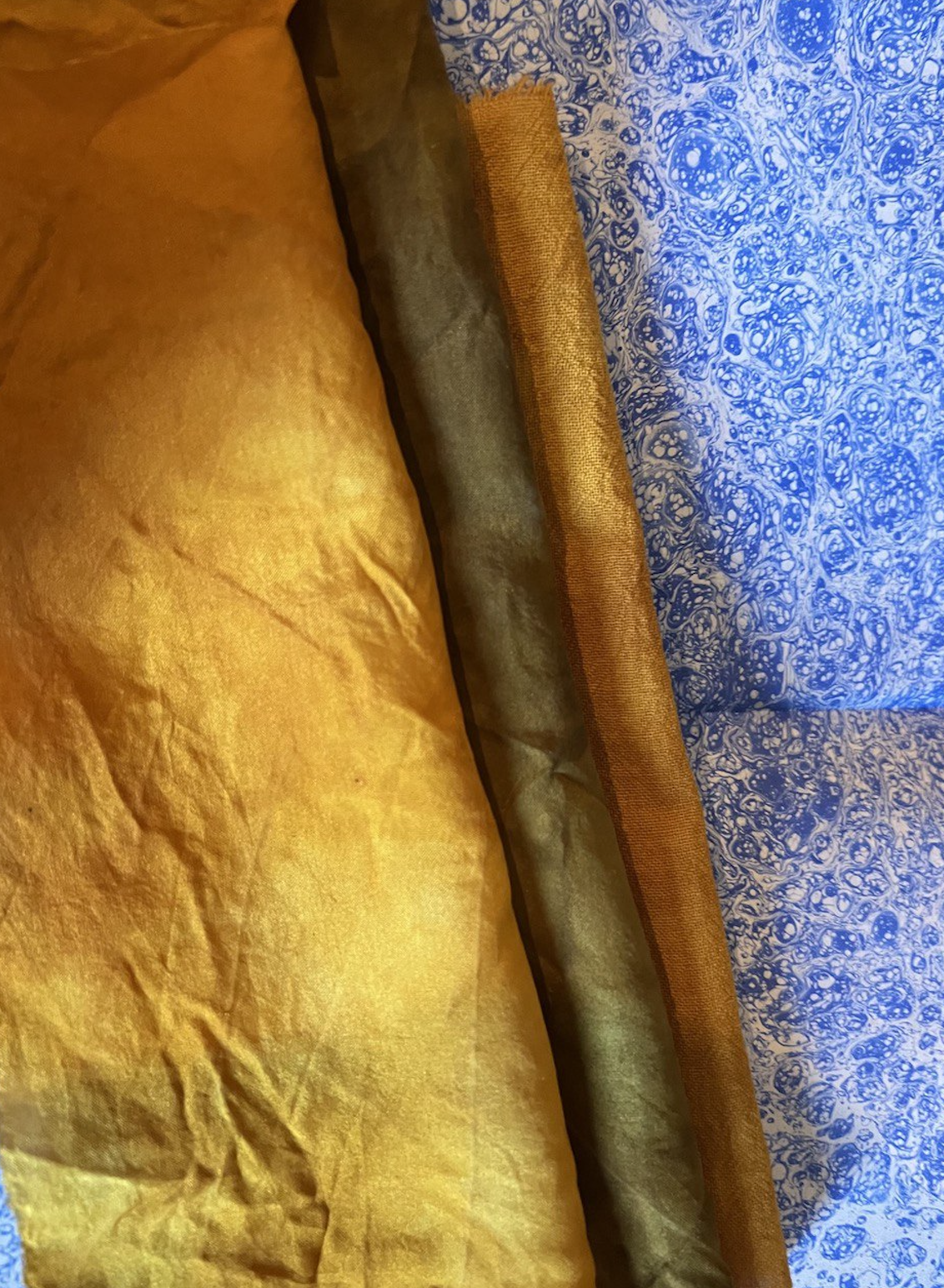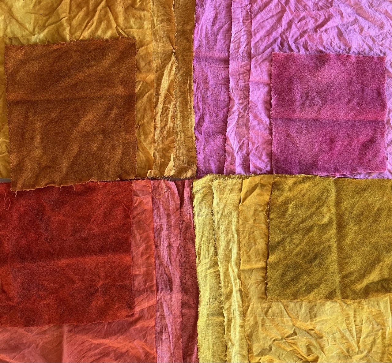 they are dyed with onion skins ( orange ), cochineal ( pink ), madder root (red-ish), and blackthorn ( yellow ), but these are only layer 1 fun then you can add some iron, copper, and others to slightly change the tone, magic!