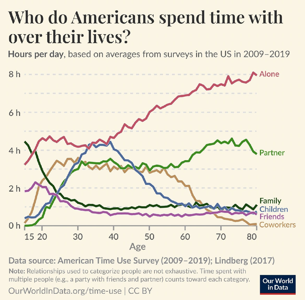 I don’t know how much this chart changed over time. But it kind of makes sense: people between 25-45 spend more time with children, also spend more time with partners once they retire, the age when people spend more time alone is about the same age when “children curves” turns downward. However, a comparison with the older years would be also interesting to see.