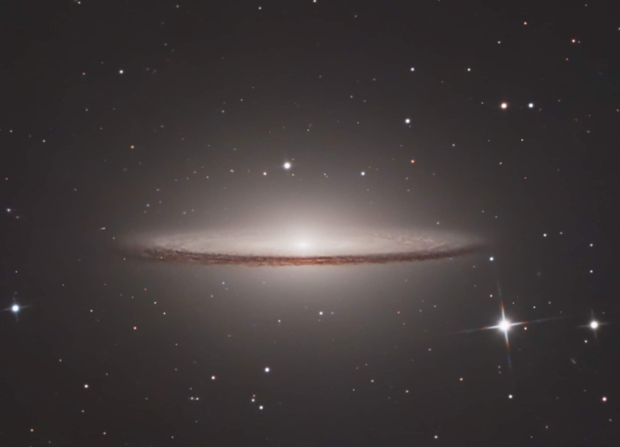 The Sombrero Galaxy, also known as M104 or NGC 4594, is a barred spiral galaxy located in the constellation Virgo. Notable for its distinctive appearance, with a band of dark dust surrounding its glowing core, it resembles a Mexican sombrero. It is relatively close to Earth, about 28 million light years away, and has a diameter of approximately 50,000 light years. The Sombrero Galaxy is active in star formation, containing regions of intense star birth activity. It also harbors a supermassive black hole at its core, with a mass equivalent to more than a billion times the mass of the Sun. Additionally, it is a prominent target in the Messier Catalog, being the 104th entry. Its distinctive shape and intriguing beauty make it a popular target for astronomical observation.