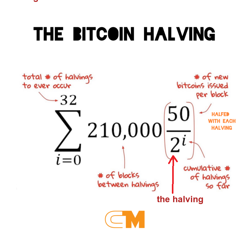 Let us quickly sum this: The incentive to mine Bitcoin and thus to provide computing power and energy to secure the network against attacks and validate Bitcoin transactions is that the miner receives Bitcoin in return, the so-called mining reward. This reward follows a fixed schedule, encoded in Bitcoin's DNA, and halves roughly every four years. This graph summarises the Bitcoin halving concept mathematically.