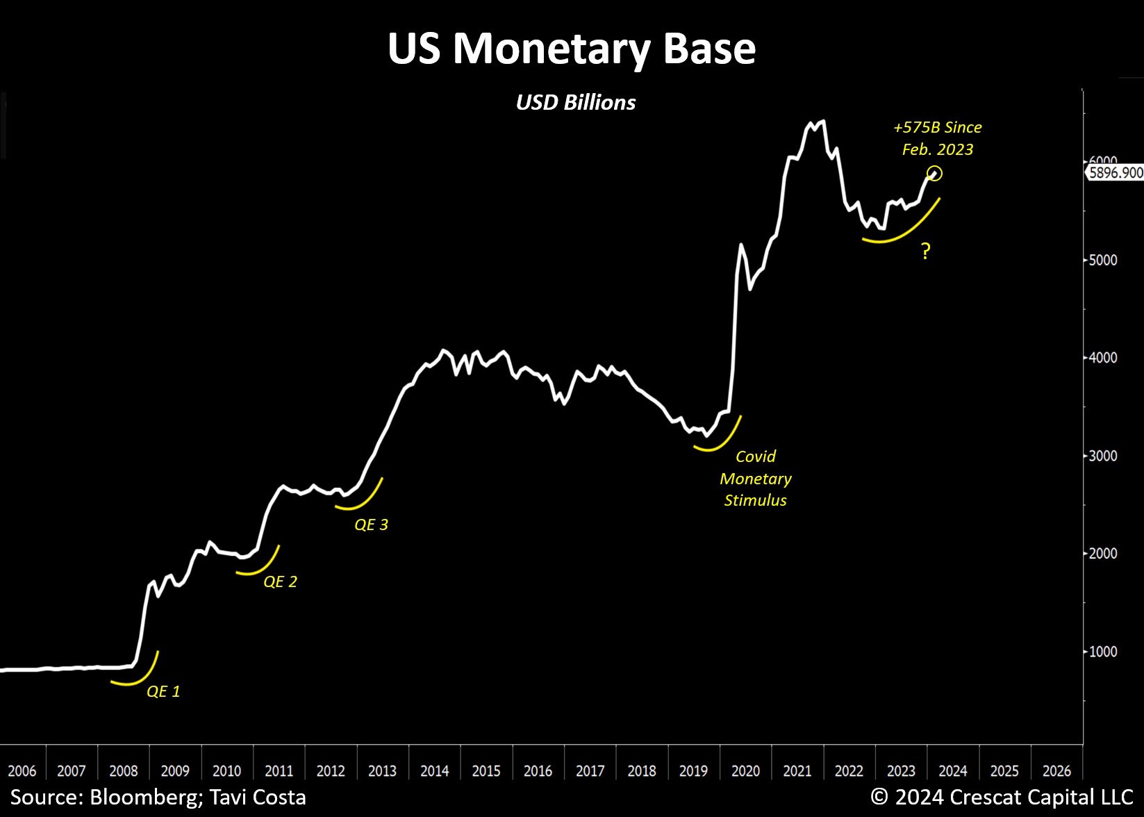 In another notable surge, the US monetary base has increased by $53 billion, marking a significant uptick of $575 billion since February 2023.