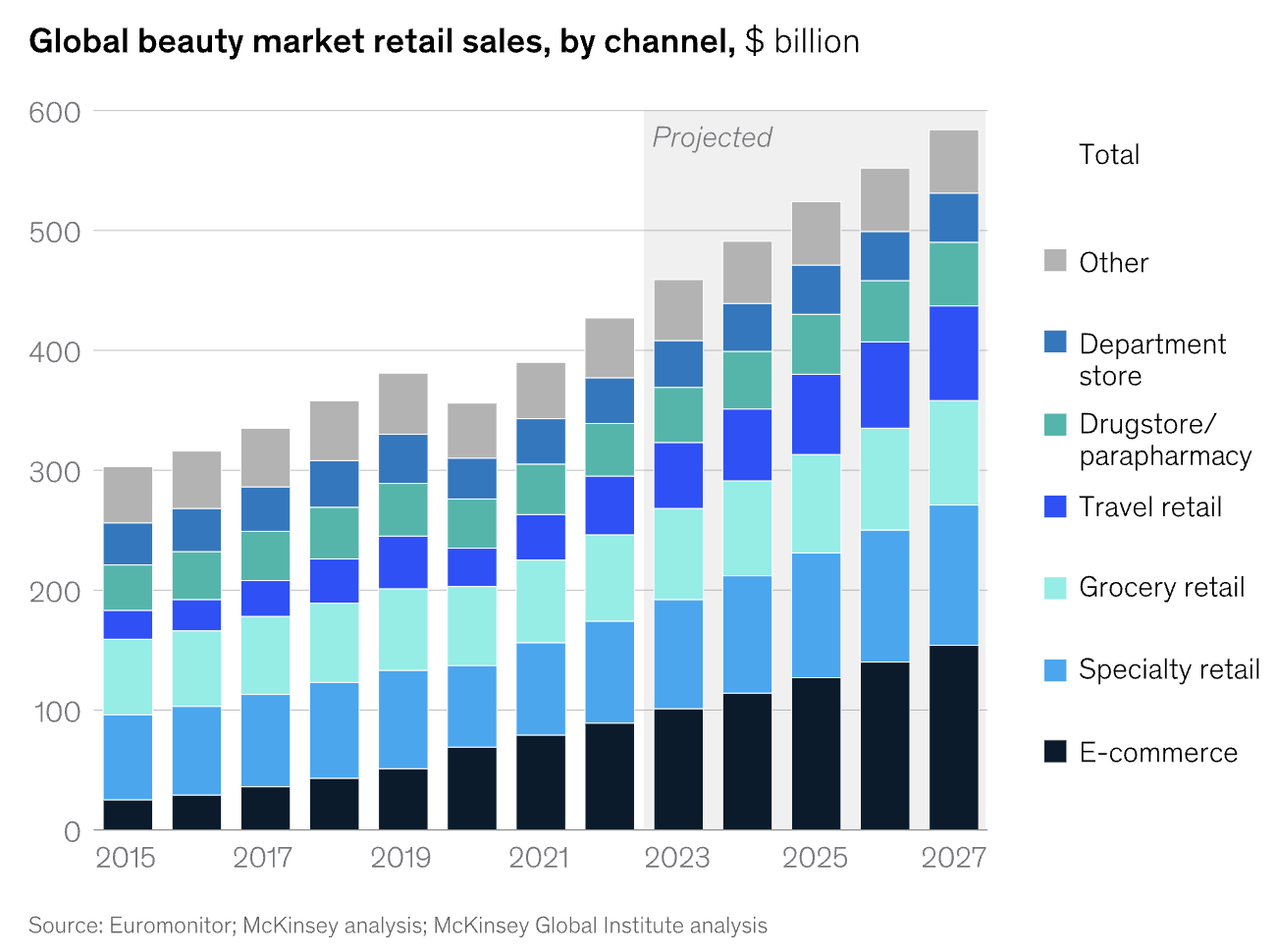 What prompted the discussion was news of Macy closing 150 stores and refocusing on luxury retail (and implicitly luxury cosmetics). Even as e-commerce picked up, it only ate up new demand. Mckinsey suspects department stores sales will grow and perhaps that's part of Macy's motivations as well.