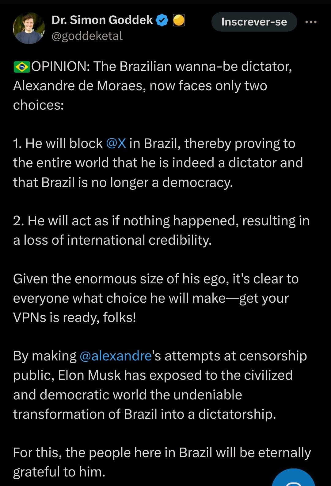 After reading all this, I think it would have been cooler if Elon would have stayed silent and then, all at once, issued his "shame" tweet, while at the same time dumping all the docs that he just announced that he's going to dump. That way, Brazilians would have max time to see them.