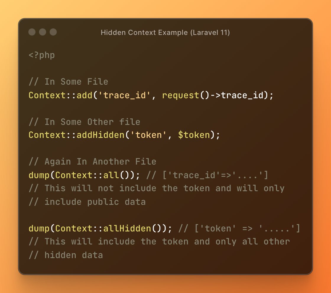 Laravel 11 provides us with the Context Facade that allows us to define and access contextual data for the current request, which automatically gets logged as metadata in the log files in case of any errors.