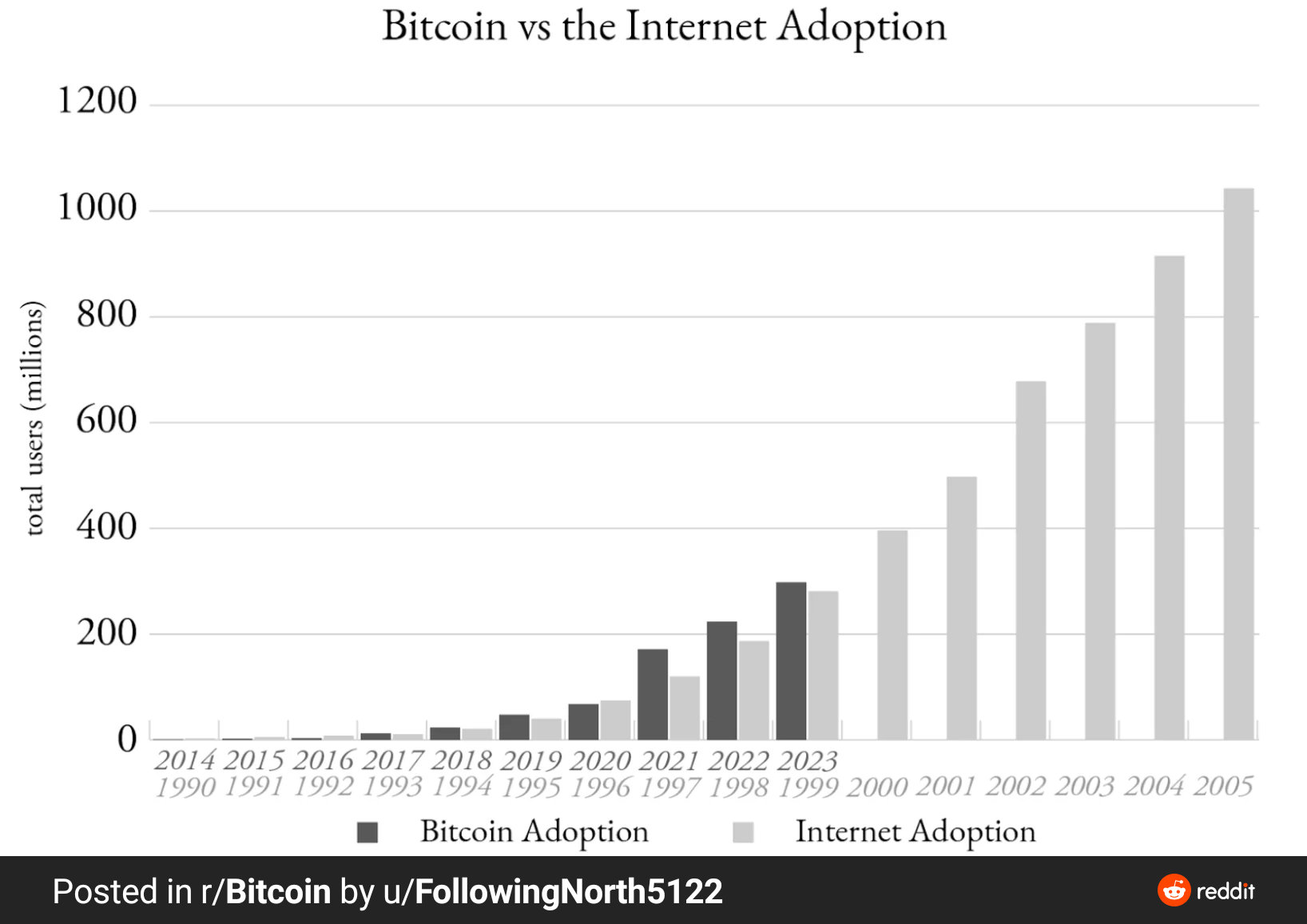 Bitcoin is currently keeping the same pace as did internet within its first 15 years. Bitcoin is toe to toe with internet in terms of its adoption year to year.