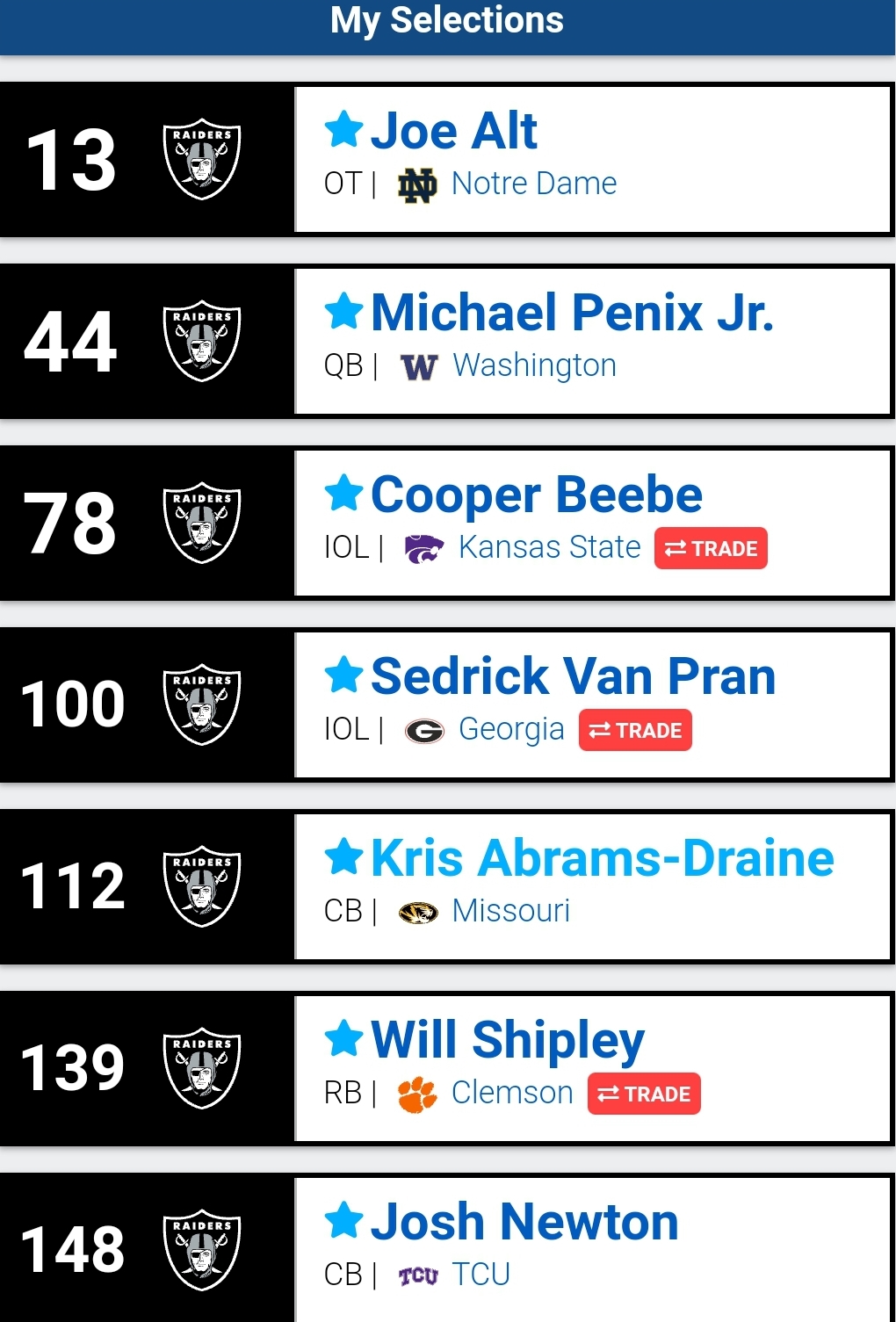 Alt wasn't there in the 1st mock I did, I was surprised I got him and Penix. I took Van Pran in the 49ers mock as well