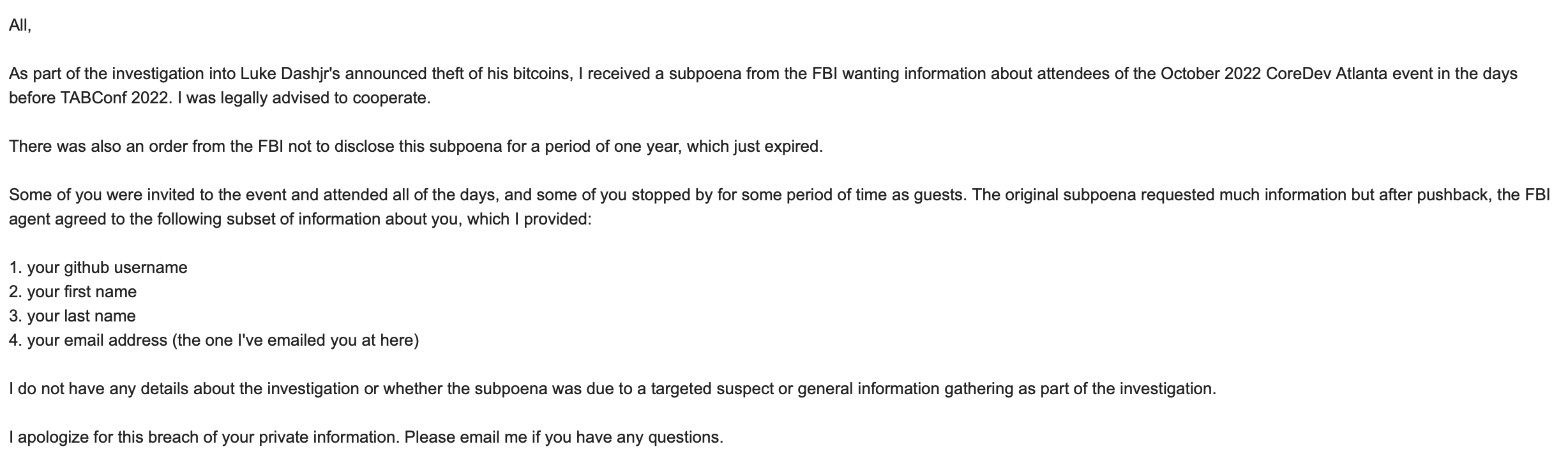 As part of the investigation into Luke Dashjr's announced theft of his bitcoins, I received a subpoena from the FBI wanting information about attendees of the October 2022 CoreDev Atltanta event in the days before TABConf2022. I was legally advised to corporate.