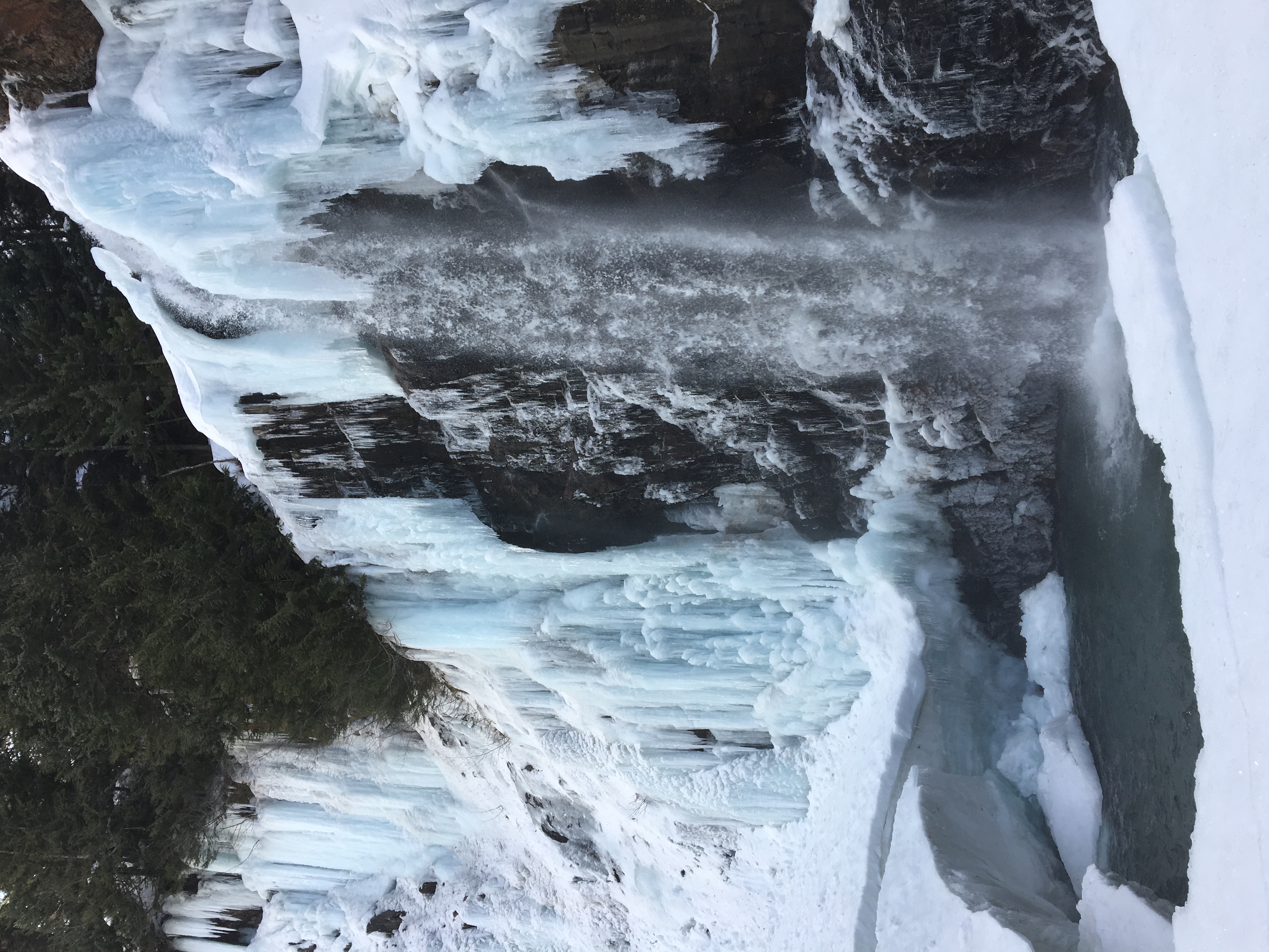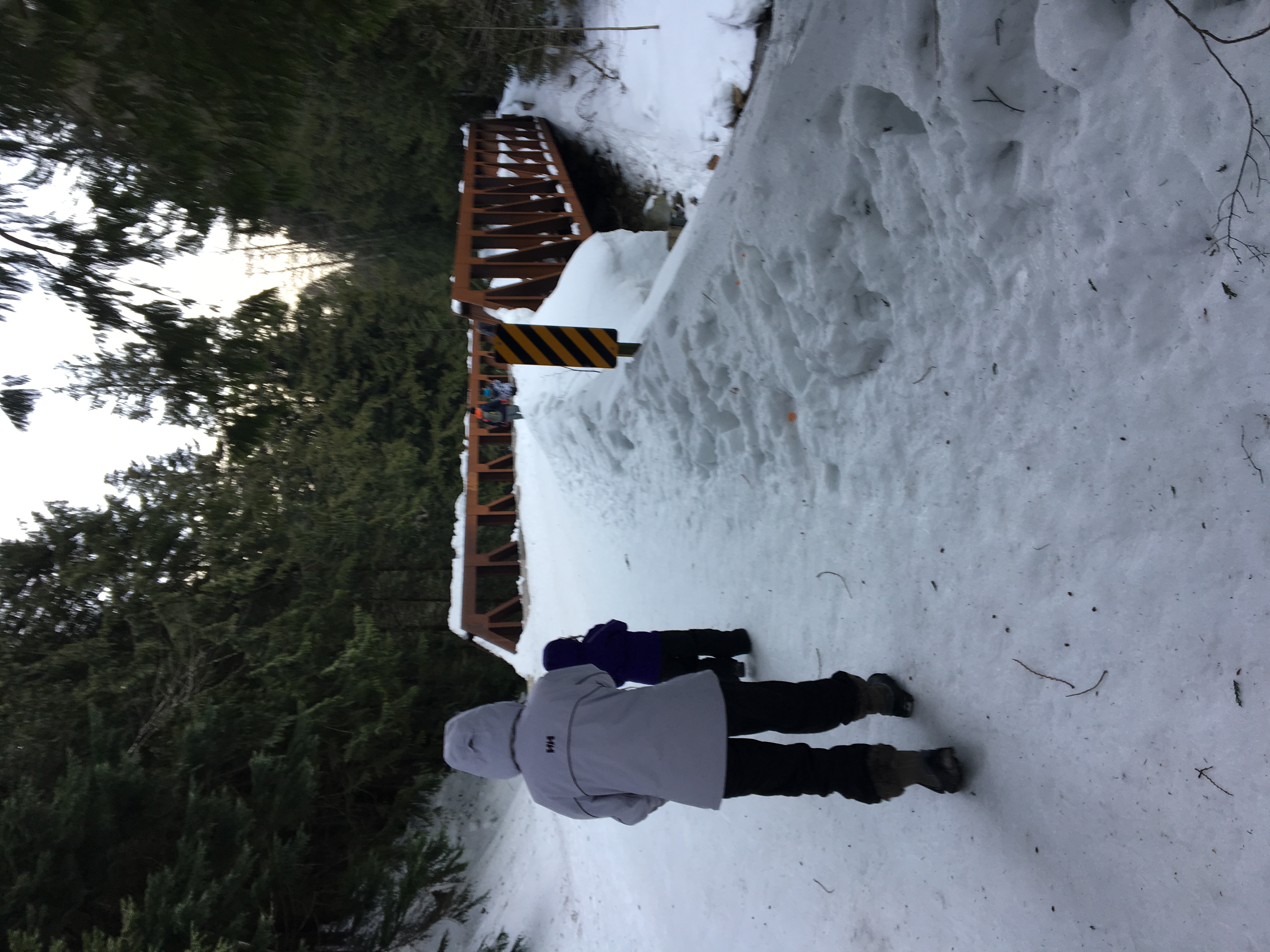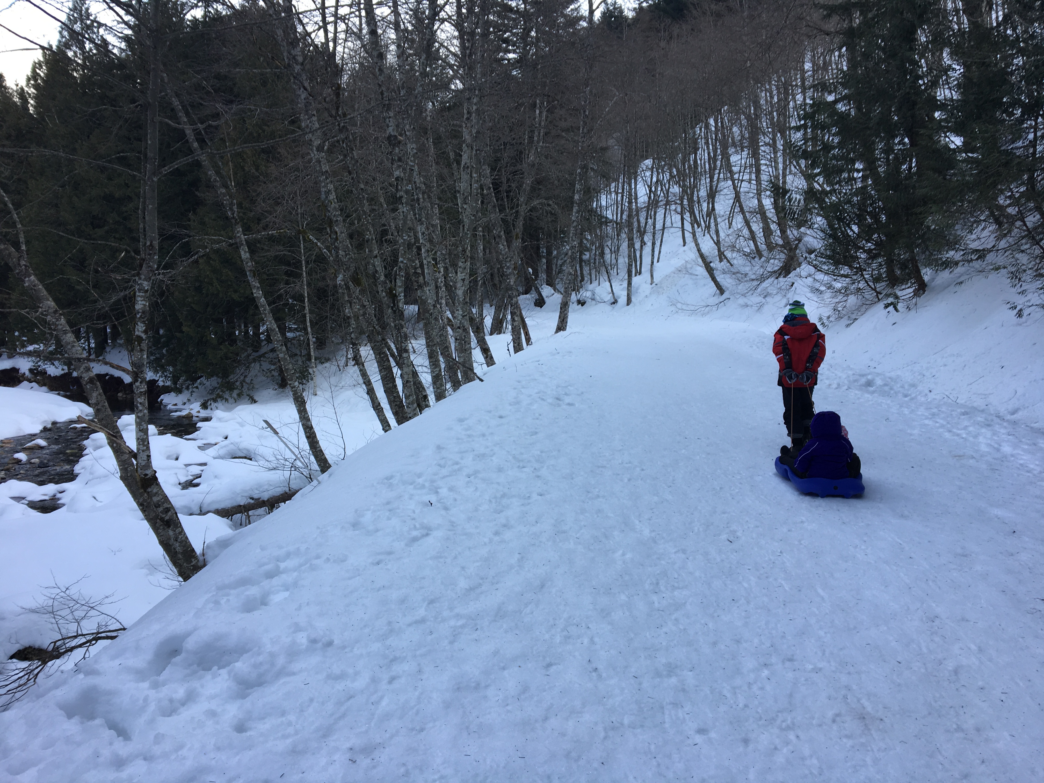 We went on this hike after hearing about it from my sister in law back in early 2017, during which time, my daughter was only 5 and my son 4. I only have 1 back, and could not carry both children on my back, and since the whole trail was covered completely in packed snow (it is a popular winter trail, and the snow on trail is usually packed down by hikers), we borrowed a plastic sled from my sister in law and pulled both children on it. Another problem with going in winter is that the access road leading from the highway to the trailhead parking lot also get covered in snow or ice, and often times gets closed down to vehicles for safety reasons. As such, it is an extra 3.9km walk just to get from where we can park our cars to the trailhead. Of course, on an out and back trail, all distances gets multiplied by 2, so it's close to an additional 8km added to the short 3.2km hike, making the trail quite a bit longer. Of course, a mere additional 8km walk in ice and snow could not detract my wife from reaching and seeing a partly frozen waterfall in person for the first time, so onward we go and forward we pull. My kids were little at the time, but pulling both of them on a sled continuously uphill proved to be quite tiring. Good thing my sister in law's family came along and her two teenage sons took turns helping with pulling the sled.