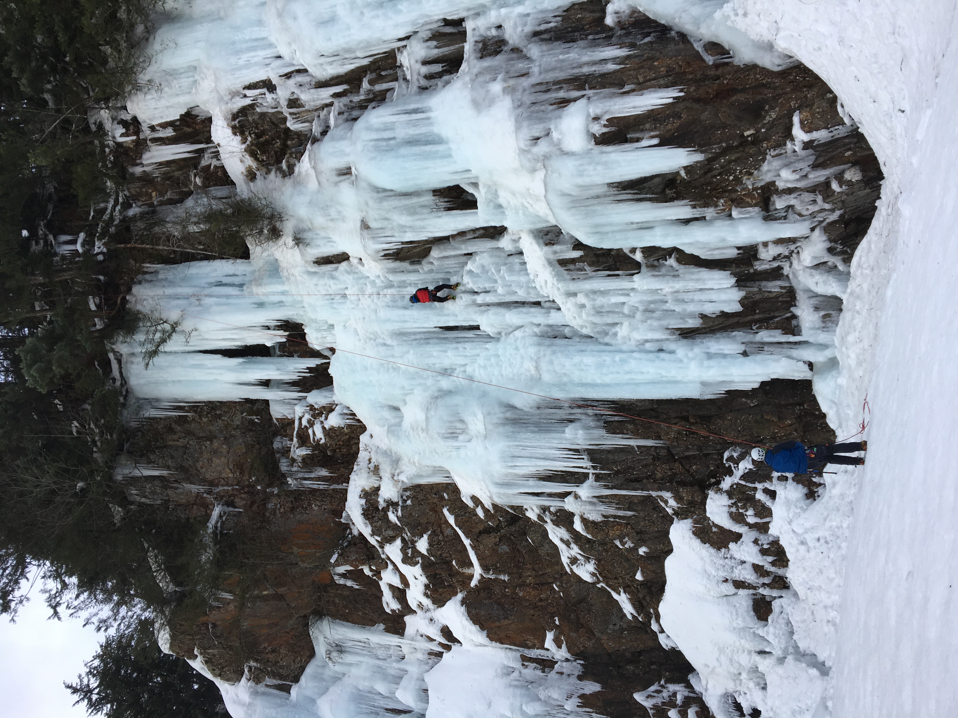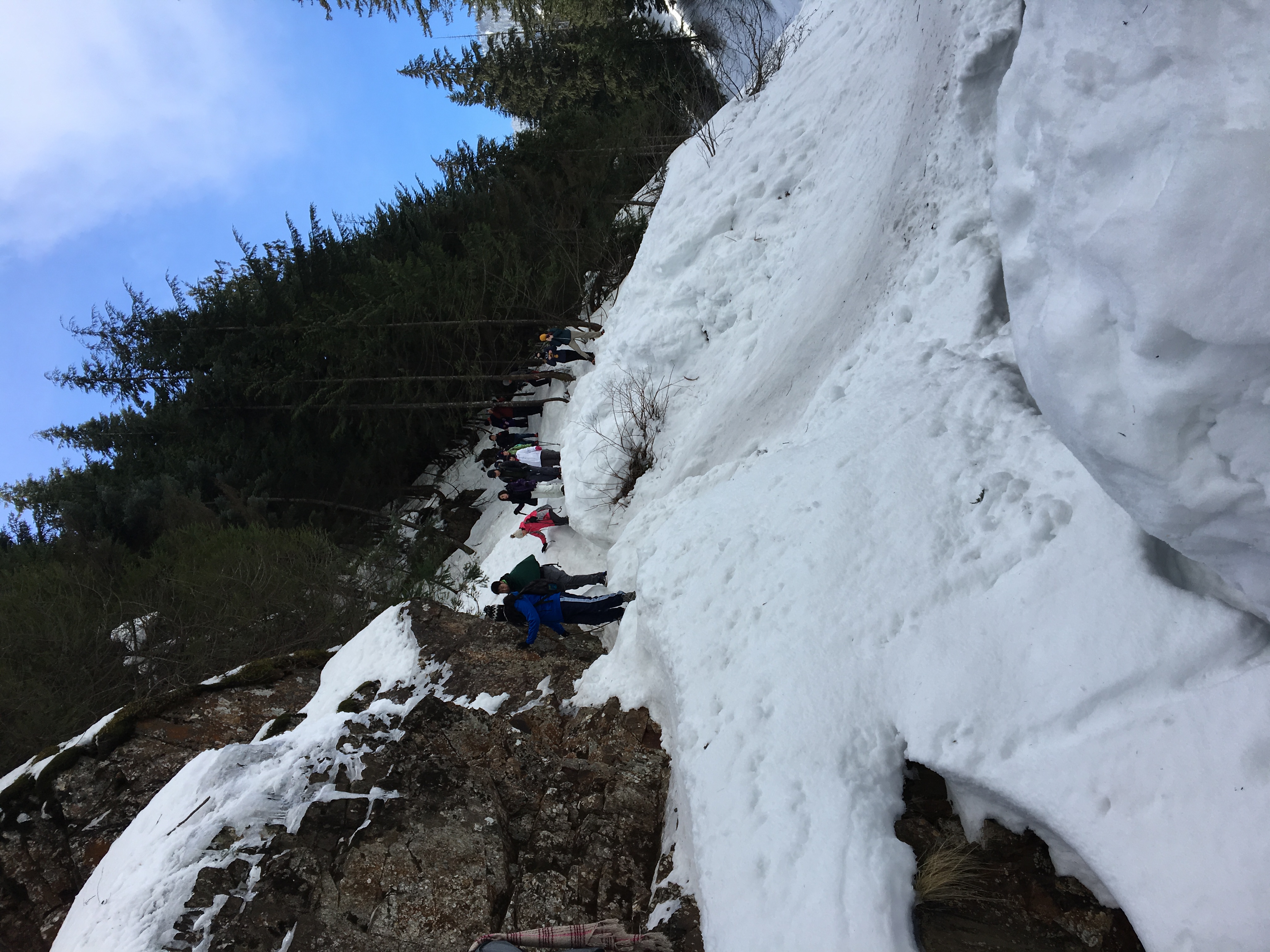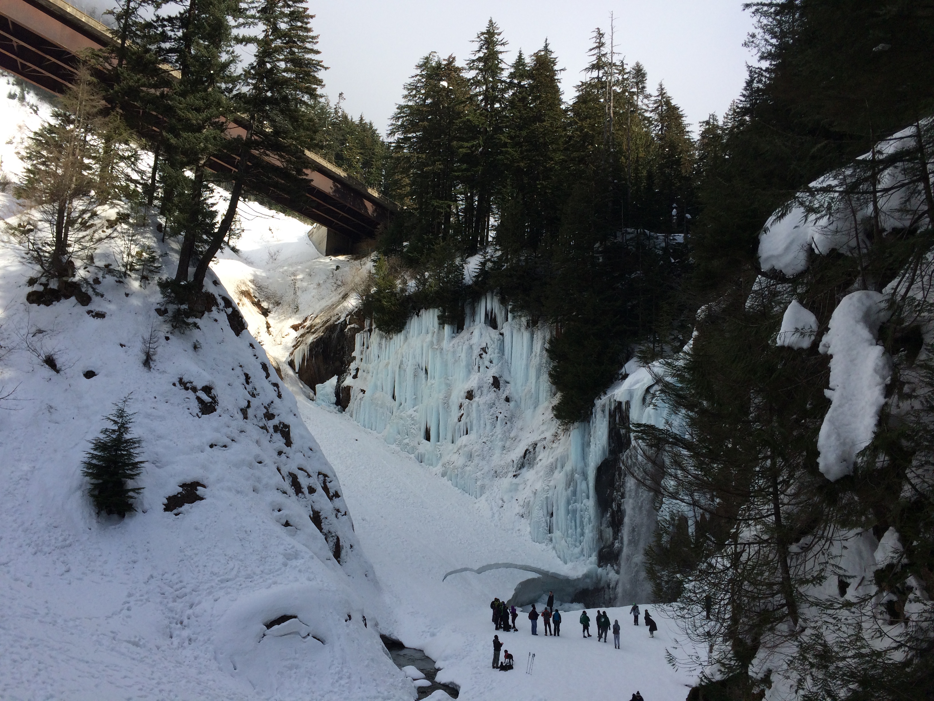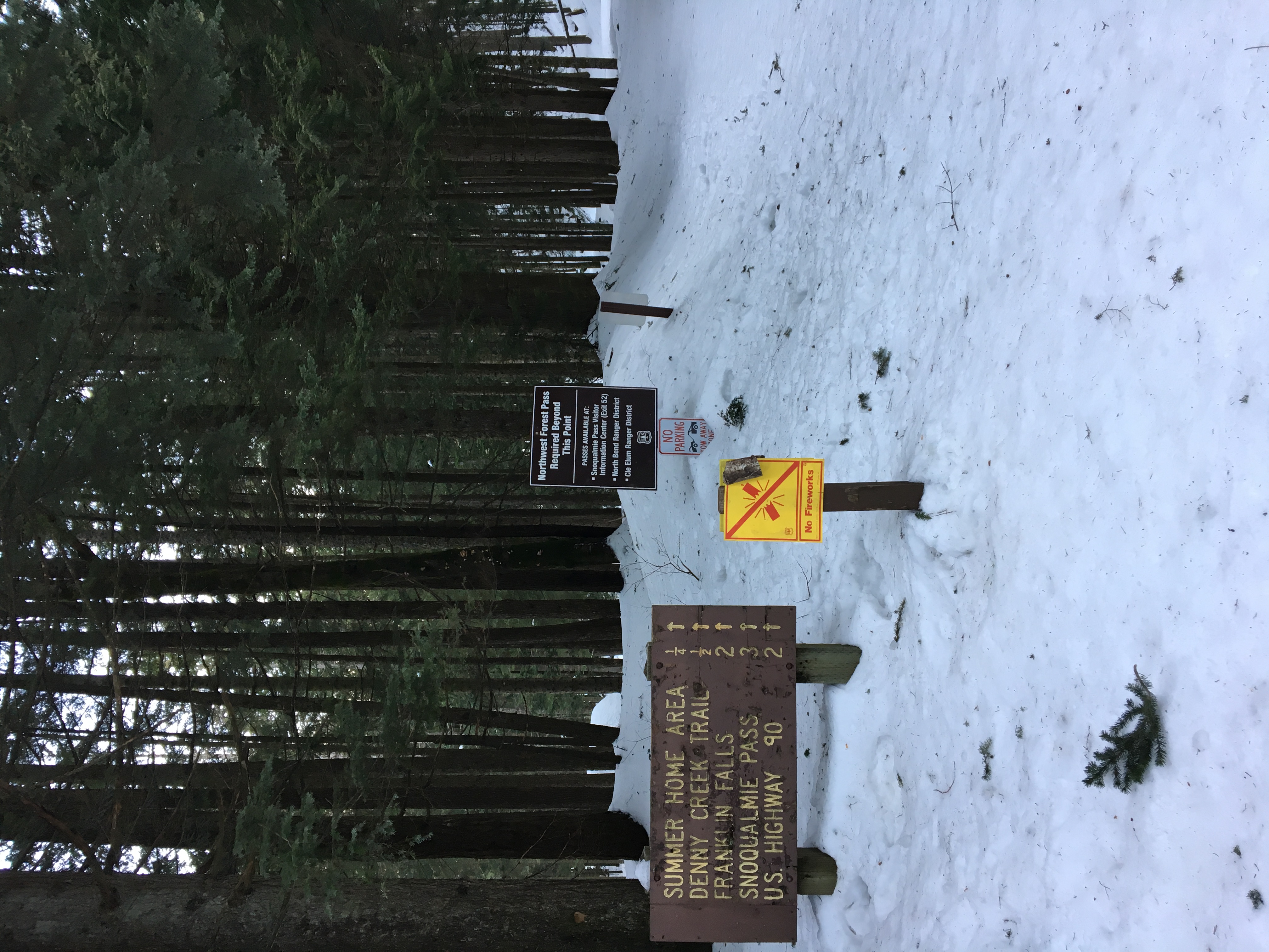 After about an hour of walking up the service road, we finally reached the trailhead marked by a toilet and some signs. The trail starts off wide and flat and eventually narrows. Like many typical northwestern trails, it weaves through lots of trees and at times passes by a creek / river. The trail is straight forward and clearly marked, until we near the falls, where the trail leads down a narrow steep slope. We had to ditch the sled and descend the narrow slope with care, but once we passed the slope, we reached a large area where people are taking photos or admiring the view of the partly frozen Franklin Falls. We took our own photos and spent our own time admiring the surrounding view. As also saw a guy ice climbing to the side, which was quite cool to witness. After spending our time at the falls area, we made our way back the trail and down the access road to our cars. One final thing I recall from this hike is that going downhill with two kids in a sled is much easier than going uphill.