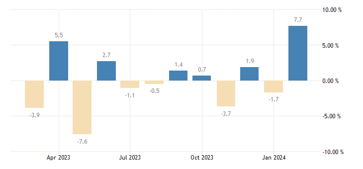 Japan's core machinery orders soared to new heights in February 2024, marking a significant rebound from the previous month. Excluding orders for ships and electric power companies, the figures surged by a remarkable 7.7% month-on-month, reaching a staggering 886.8 billion yen. This surge defied market forecasts, which had anticipated a mere 0.8% increase, showcasing the resilience and vigor of Japan's industrial landscape.