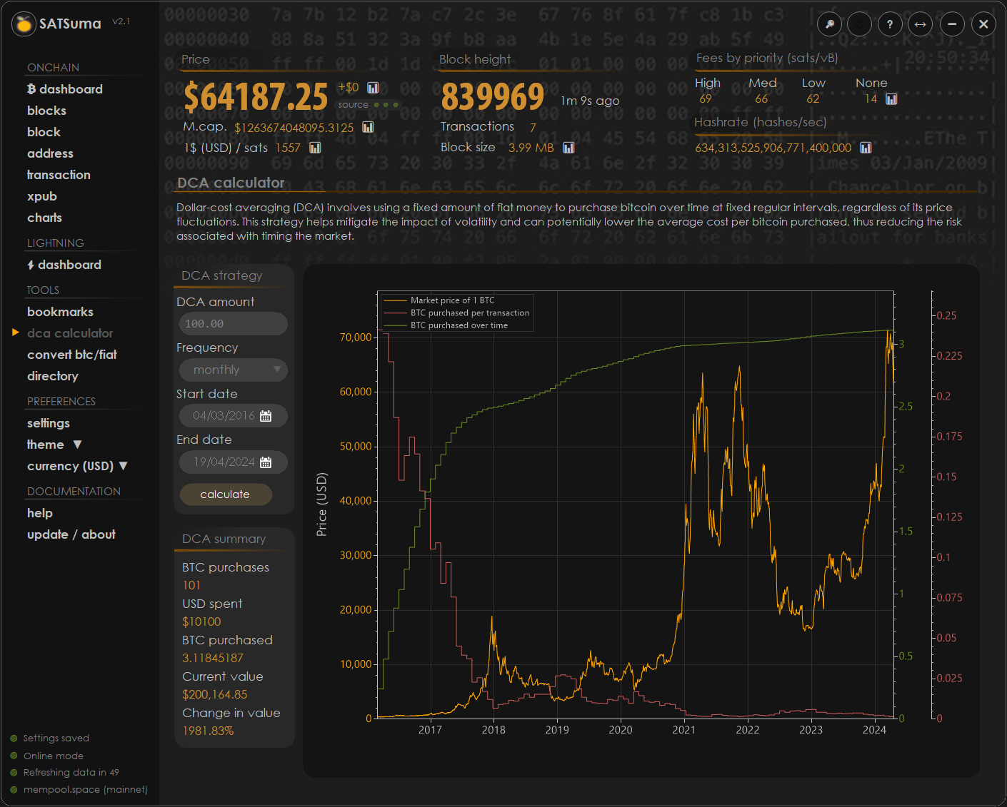 In the end, I decided to incorporate the DCA calculator into my existing app, SATSuma. There's a new DCA screen which visualises your DCA strategy and lets you change frequency, amounts and start/end dates.