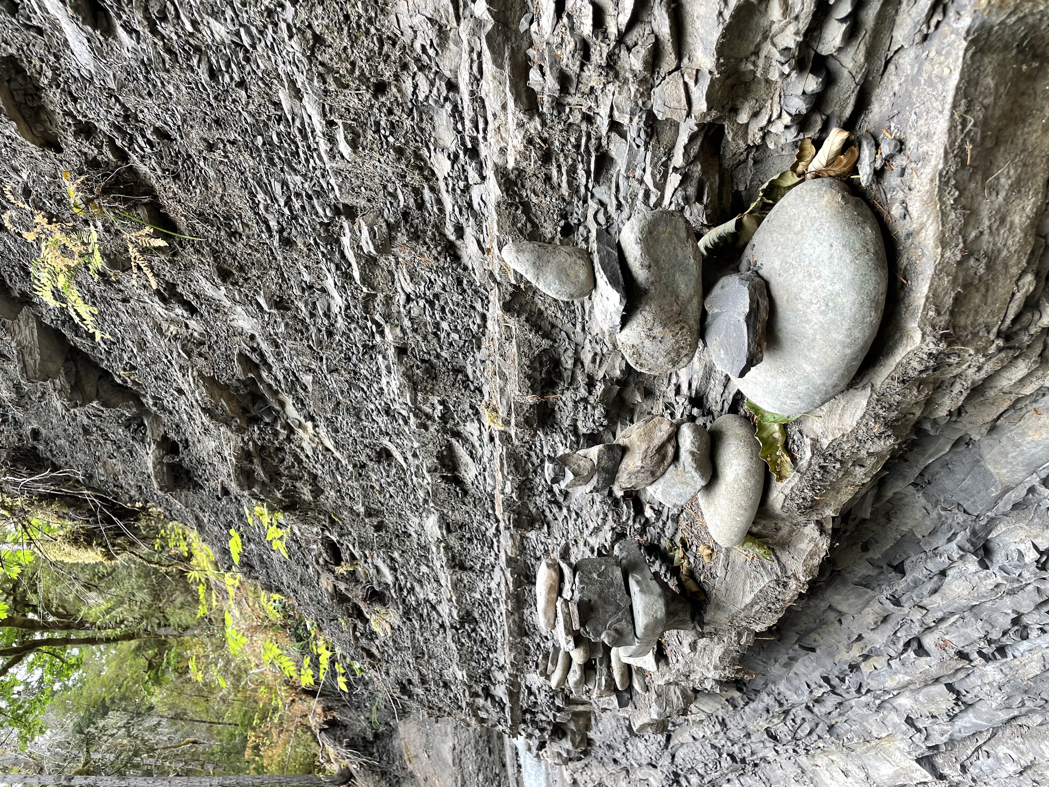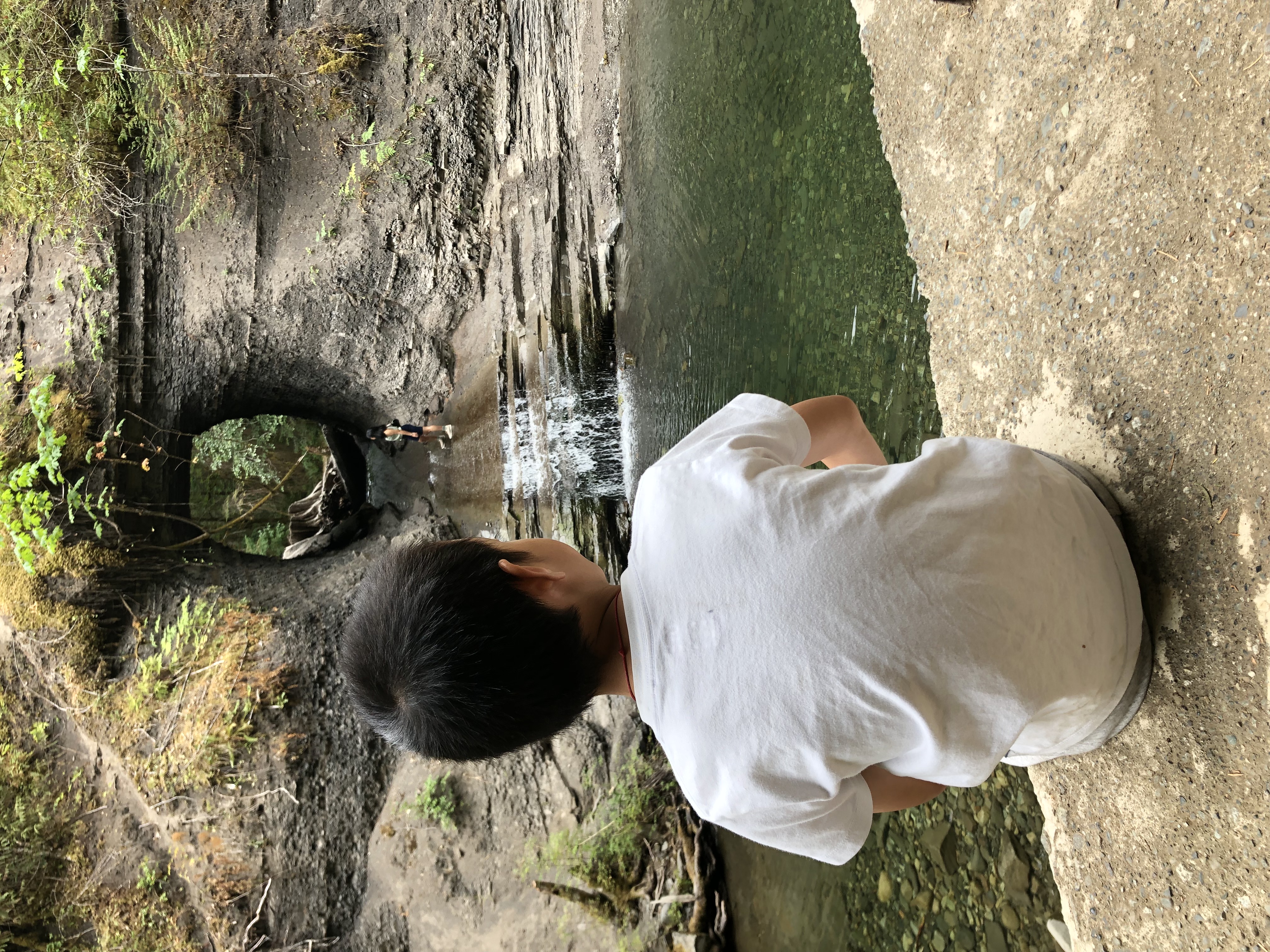 When we reached the destination, we saw water flowing through the hole. We were able to walk around the creek and get close to the hole. Along the shallow creek and the rock wall, there were quite a few stone stacks probably built by past visitors. We took our time to take some photos and let our kids play in the creek before heading back.