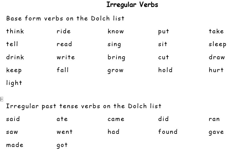 What an undertaking! I decided to simplify matters. I recalled that mastering the words from the Dolch List would enable students to read 50-75% of children’s books. I thus decided to extract the irregular verbs that are found on this list: