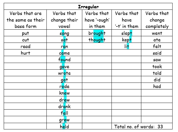 - Perhaps, we could systematise our instruction such that Year 1 and Year 2 students focus on regular and irregular verbs respectively? So, for their Mid-Year Exam, Year 1 students could be asked to fill in the blanks for past tense irregular verbs like walked, planned (double the consonant) and studied (change -y to -ied).