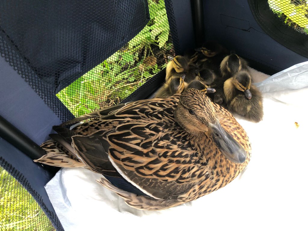 Today I have heard a quak quak and thought I'm nuts. I asked my client if she hears it, too. She denied but than heard it also. Then I went outdoors in our courtyard and I saw a duck and two little ducklings. The janitor was there and told me that a crow has already killed one. And then we heard it plopping: Six ducklings jumped from the roof (around 8m) and landed on hard ground, some seem like they were severely damaged, squeeked without coming to their feet. Oh shit. We grabbed them and brought them to their mother. They were very fluffy and sweet. The more damaged tolerated the transport and came to their feet. One was on the wrong path and very agile in my hand.