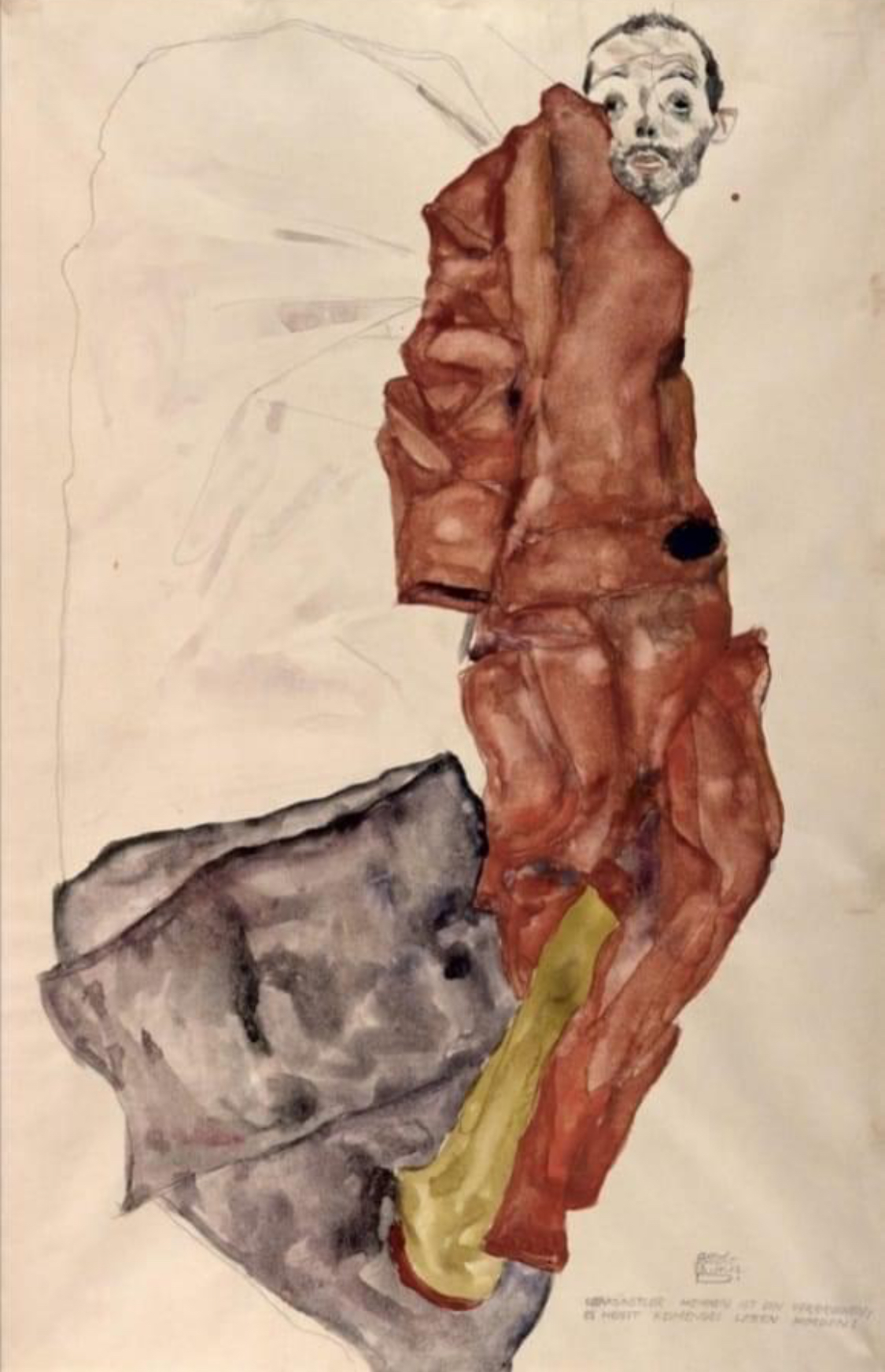 Schiele departed from prevailing conventions of portraiture and devoted himself to the unhibited exploration of his own identity through drawing. He set out in search of self knowledge in countless self-portraits, trying out noumerous roles and emotional states on his face and body. He thus put his fear and loneliness, his rage, driveness, arrogance and sexuality on full display in all of its facets, doing so in poses pathologized by society.