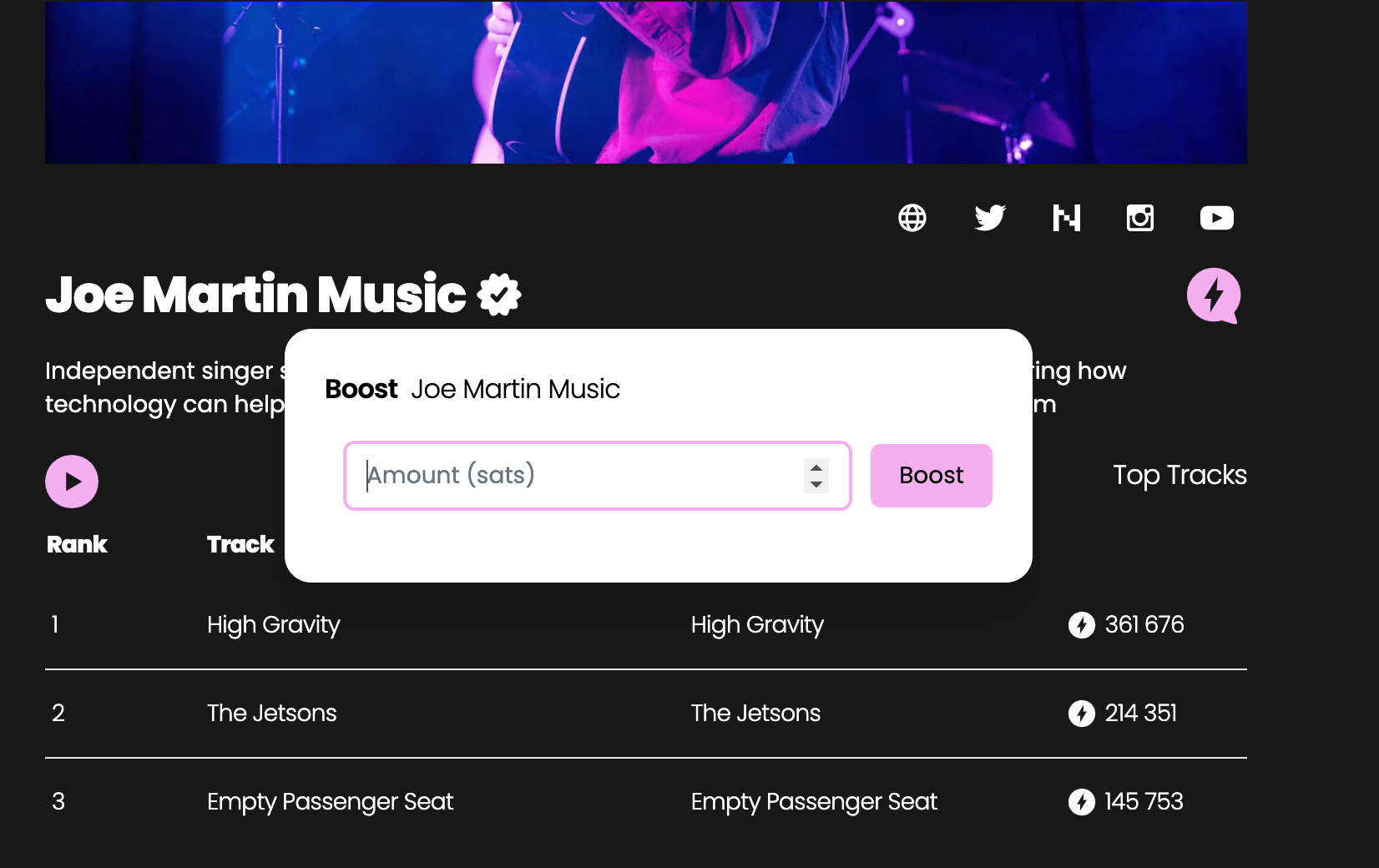 I can just zap an artist profile or a song, and choose the amount of sats I want to tip with e.g. my Alby @Alby wallet.