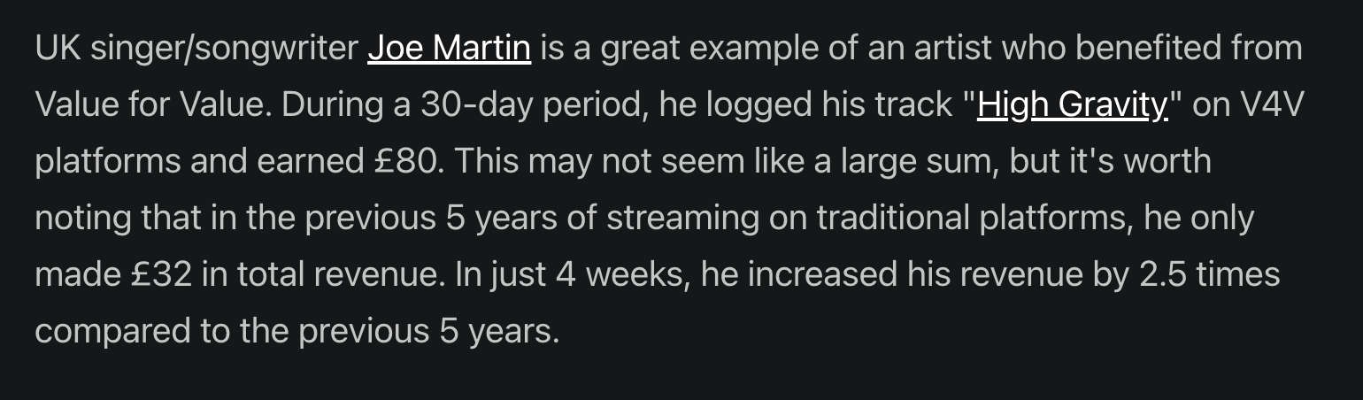 Singer-songwriter Joe Martin @joemartinmusic made more money in 30 days on Wavlake than in 5 years on traditional streaming platforms.