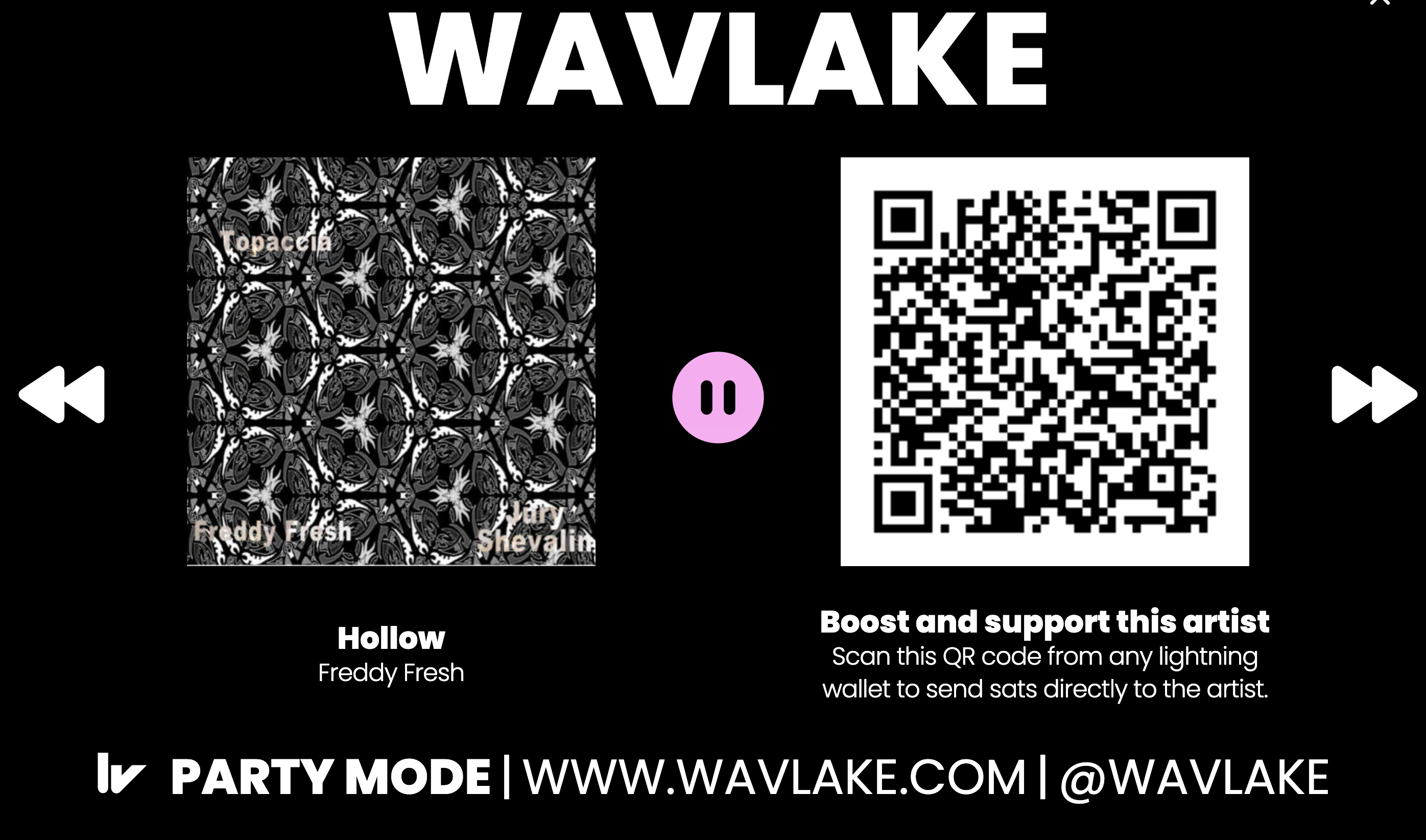 In Wavlake's "Party Mode", a radio playlist will play songs and next to the song information there is a QR code that send sats directly to the artist.