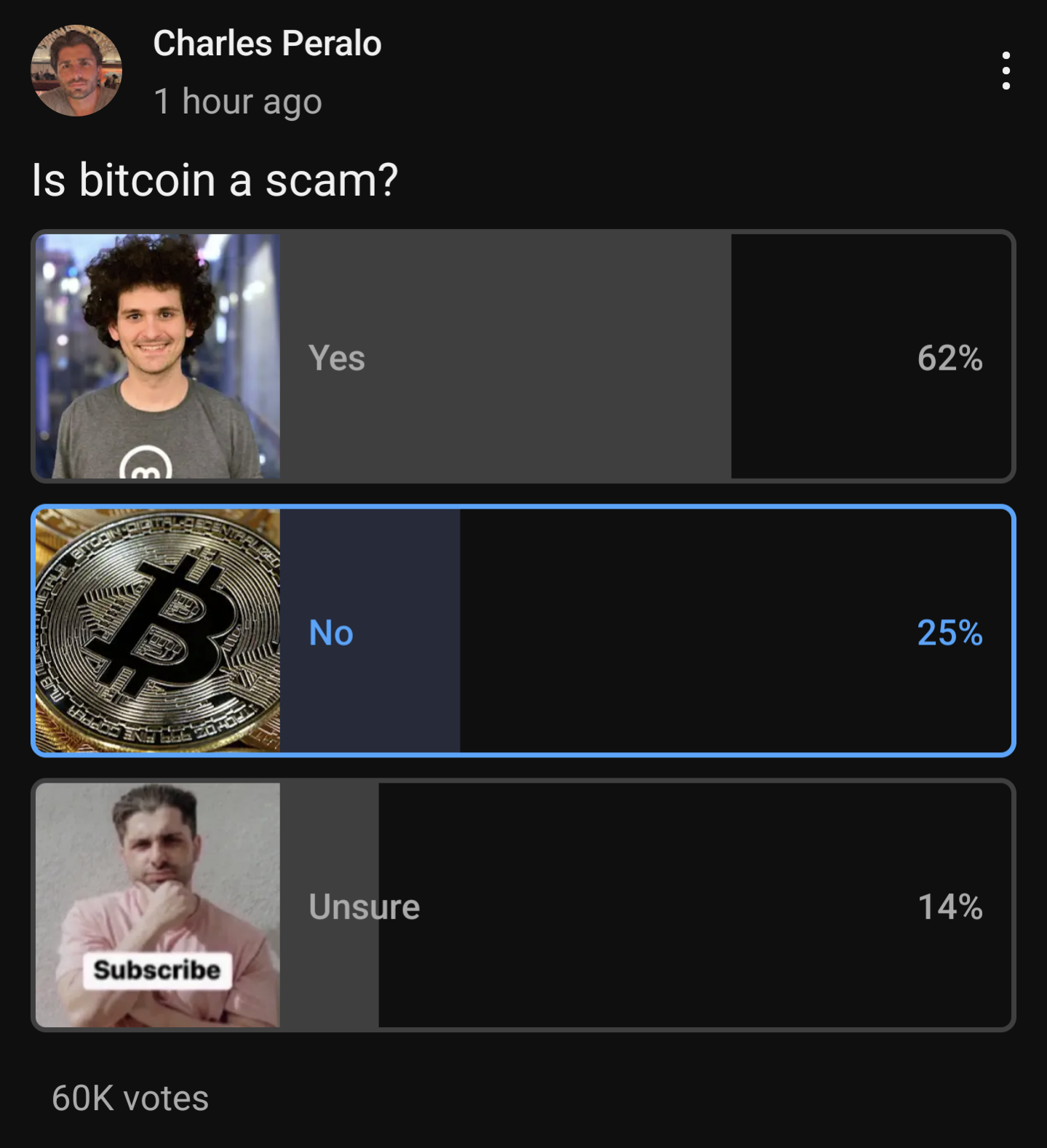 Of 60 thousand respondents, 62% said yes, which is the majority. However, 14% were unsure, and 25% said no. The comments beneath the poll were quite polarised. Those who thought it was a scam were mainly spouting the same old disproven criticisms that we are used to. There were plenty of defenders of Bitcoin, but on YouTube their arguments are not as eloquent or persuasive as I've seen elsewhere. Plenty are still arguing for "crypto" or "Blockchain technology", while only a few were actually arguing for Bitcoin.