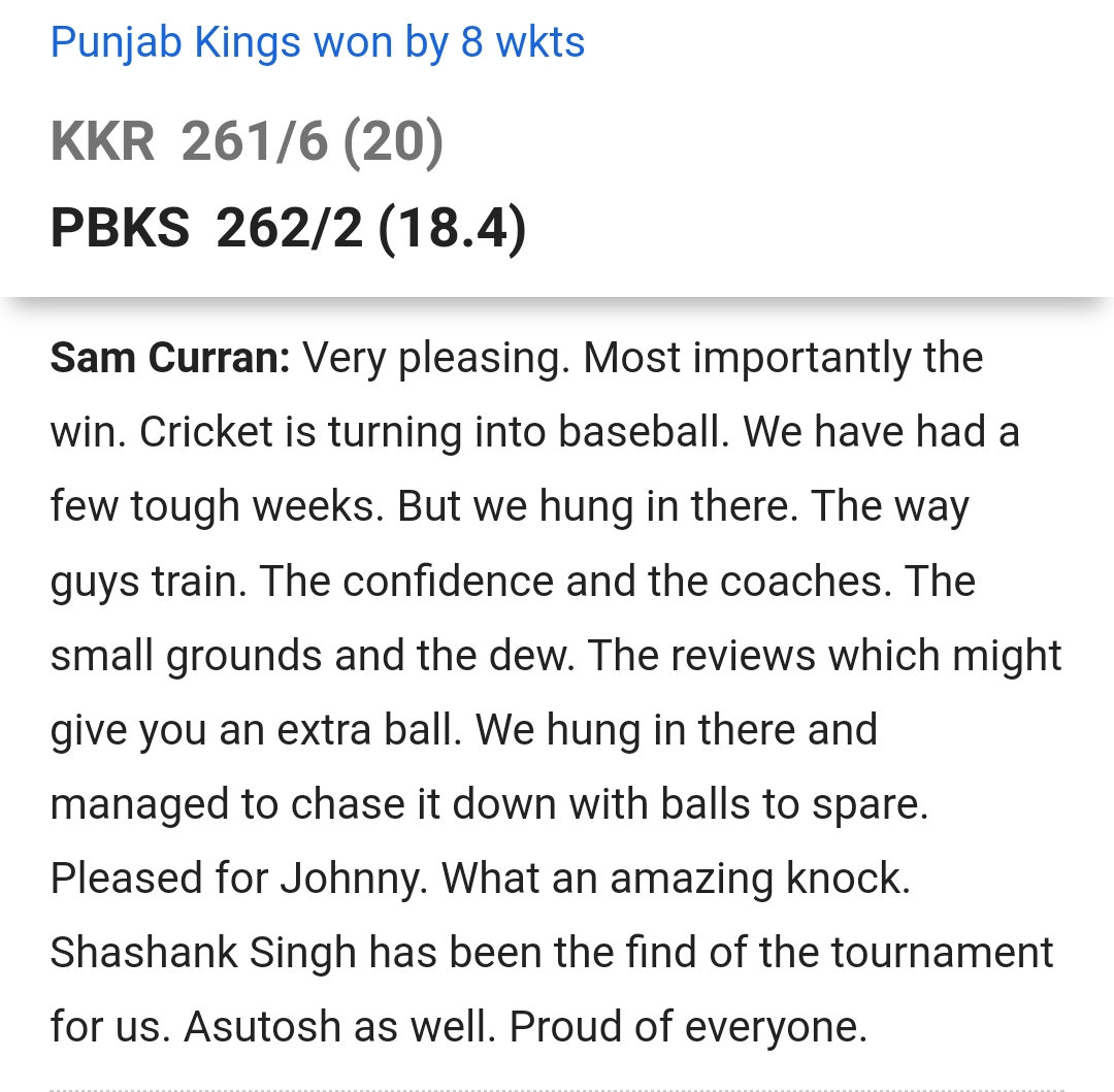What do I say? How do I define this? All of you can catch your breathe for starters. Because Prabhsimran started on fast lanes. We thought it will eventually end and it did. He was run-out after his fifty. But Punjab had tallied 93 in the powerplay. Rossouw came in and Bairstow just got going. They had a tough time against Narine and the West Indian got rid of Rossouw. But Shashank Singh came in and the rest as they say was history. He just toyed with the bowlers. He plucked sixes like we pluck apples in an orchard. Bairstow was a happy spectator at the other end. He scored a 100 in his comeback game and Punjab romped home in 18.4 overs. Almost 250 runs came in just sixes! That tells you how hapless the bowlers were. It indeed was bat vs bat and the batters of Punjab have outshone the home team with elan in the end. Punjab were on the brink of elimination coming into this and they have answered everyone doubting their intentions.