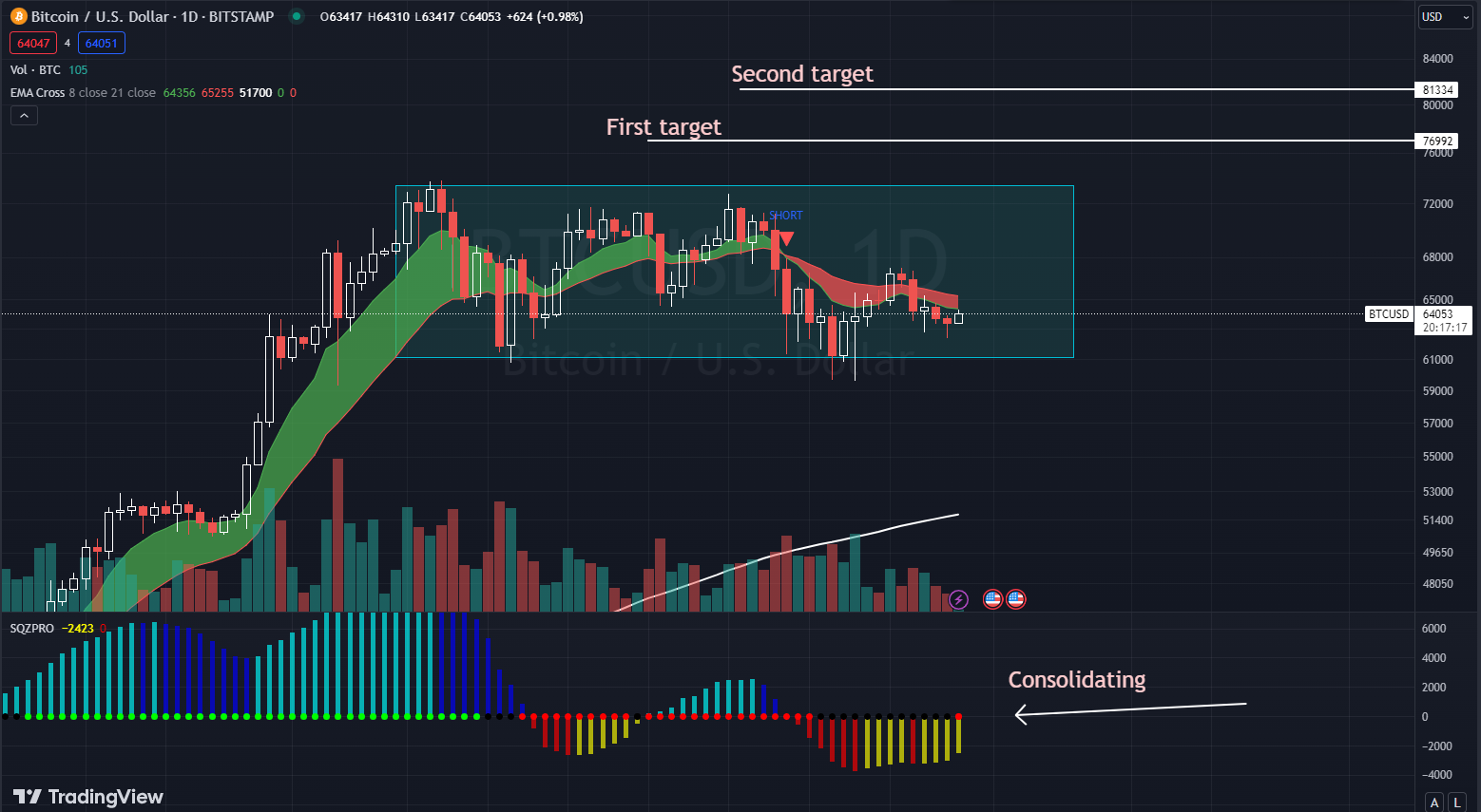 Right now, BTC is just going sideways. As long as it just does this, though, I think it can go to 52k (which would still be bullish). I see these potential prices, I think it takes another event. It's depressed mostly right now because of the wars, but if the Fed starts cutting rates, we can really see BTC really go!.