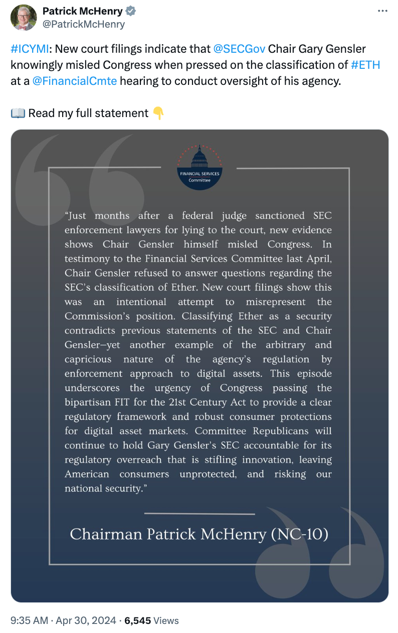 As Chairman McHenry notes the SEC has already recently been sanctioned by a judge for lying to the court making, if these accusations are true, a culture of disregard for the law permeating from the SEC. It was in 2018 that while teaching at MIT he discussed how ETH was not a security only to start to change his mind it seems once he became the head of the SEC. Besides the Binance settlement, the SEC has spent years and millions of dollars on going after crypto companies with Ripple being the shining example of their complete failure and incompetence.