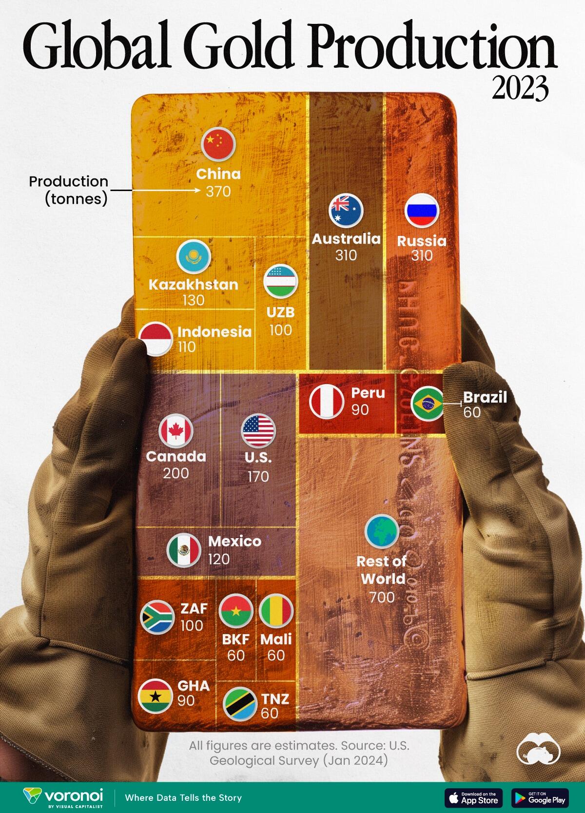 In this graphic, Visual Capitalist's Marcus Lu lists the world’s leading countries in terms of gold production. These figures come from the latest USGS publication on gold statistics (published January 2024).