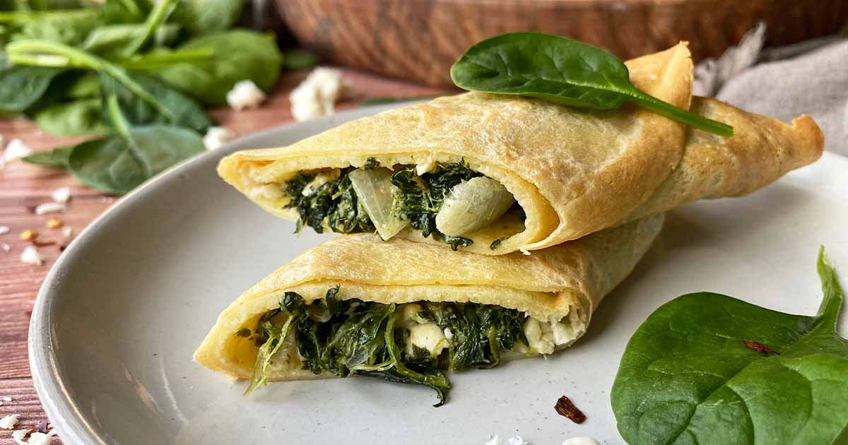 - Spoon some sautéed spinach and sprinkle feta over half of the crepe.