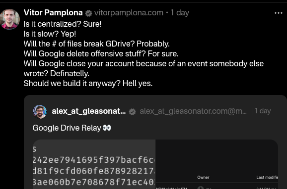 Great idea and proof-of-concept, but I started deGoogling quite a while ago. So my question / reply to this: https://njump.me/nevent1qvzqqqqqqypzqpnrnguxe8qszsshvgkvhn6qjzxy7xsvx03rlrtddr62haj4lrm3qy88wumn8ghj7mn0wvhxcmmv9uq32amnwvaz7tmjv4kxz7fwdehhxarj9emkvtcqyqtgyxpjh4t6l9eewe6yakvxh372a2v9flnuqzwpdfzx7c6luck46k07r6c