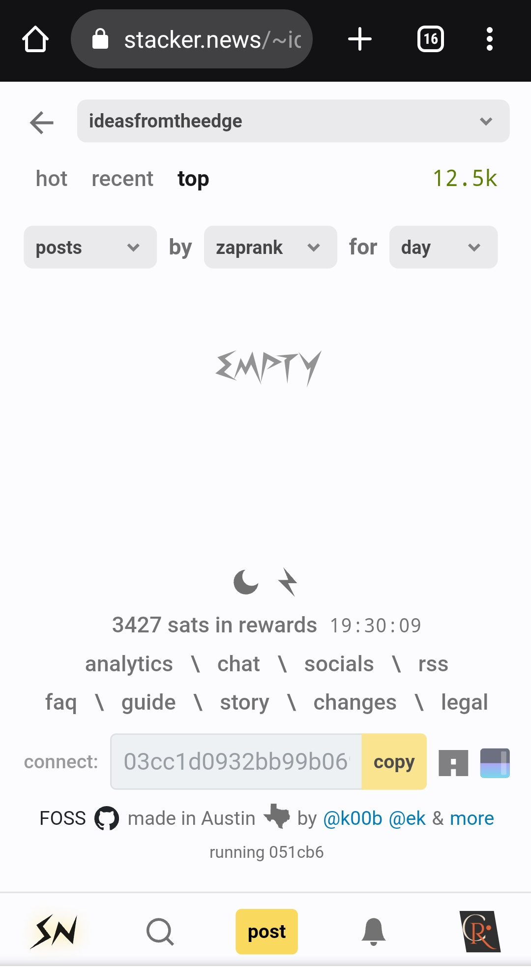 What I do know that my alm other posts in oher territories can be found with a Zaprank filter used. While this is one of my posts that did better in terms of getting zaps by stackers, I thought that it must be under the 'hot posts' but it's not, so this prompted me to see if it ranks lower in the territory, bit I could only see the list being empty. My post only displays when I change the filter to Sats. Is it normal or there's some issue?