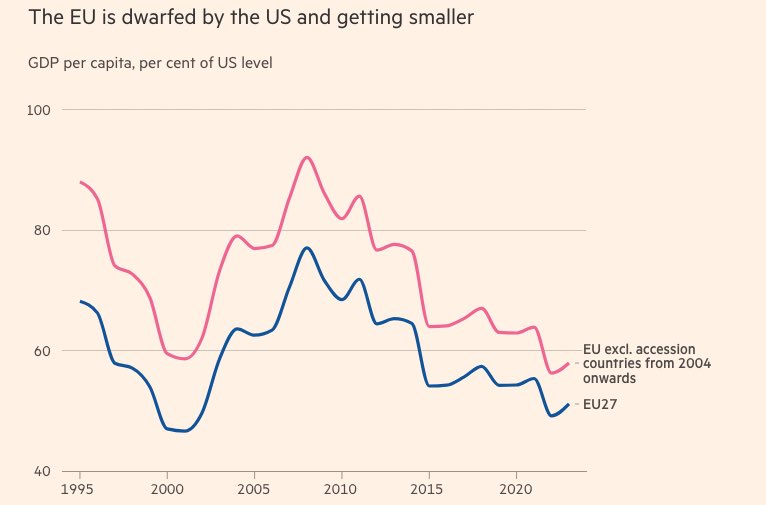 The consequence of this general attack on entrepreneurial freedom and personal initiative is the shrinking of economic productivity. Over-indebtedness, investment outflows and a widening prosperity gap with the USA as the economic benchmark are driving the decline. This trend is likely to accelerate considerably in the coming years, as the European Union has proven to be one thing above all else: Resistant to advice.