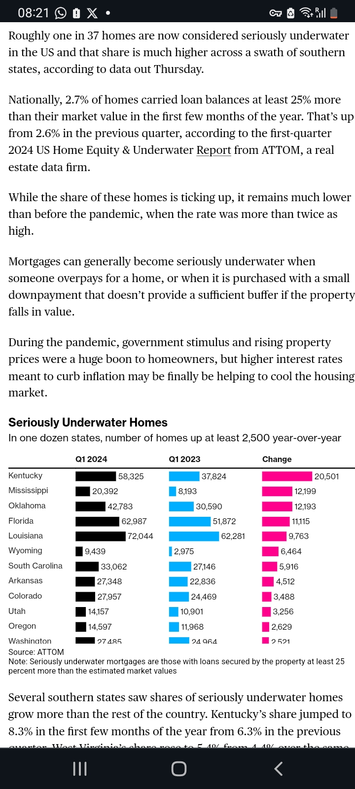Recent data reveals a concerning statistic: approximately one in 37 homes in the United States is now classified as seriously underwater, with a considerably higher proportion observed across several southern states. According to the latest findings released on Thursday, 2.7% of homes nationwide carry loan balances exceeding their market value by at least 25% in the early months of 2024. This marks a slight increase from the previous quarter's figure of 2.6%, as reported by ATTOM, a leading real estate data firm, in their first-quarter 2024 US Home Equity & Underwater Report.