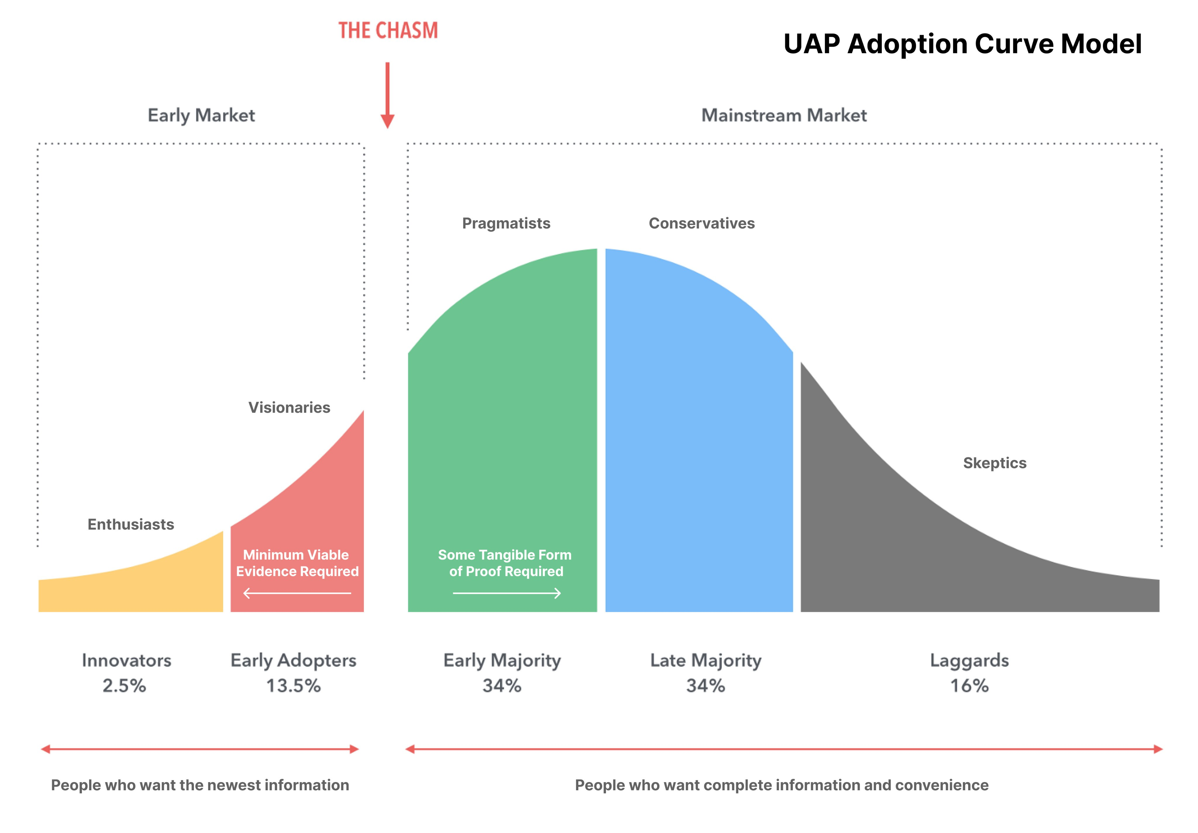 In the realm of UAP disclosure, I believe we’re at a similar crossroads. We’ve got the Innovators and the Early Adopters on board; those of us who’ve seen enough to believe something’s going on. Now, we’re edging towards the Chasm - that great divide between fringe belief and mainstream acceptance.