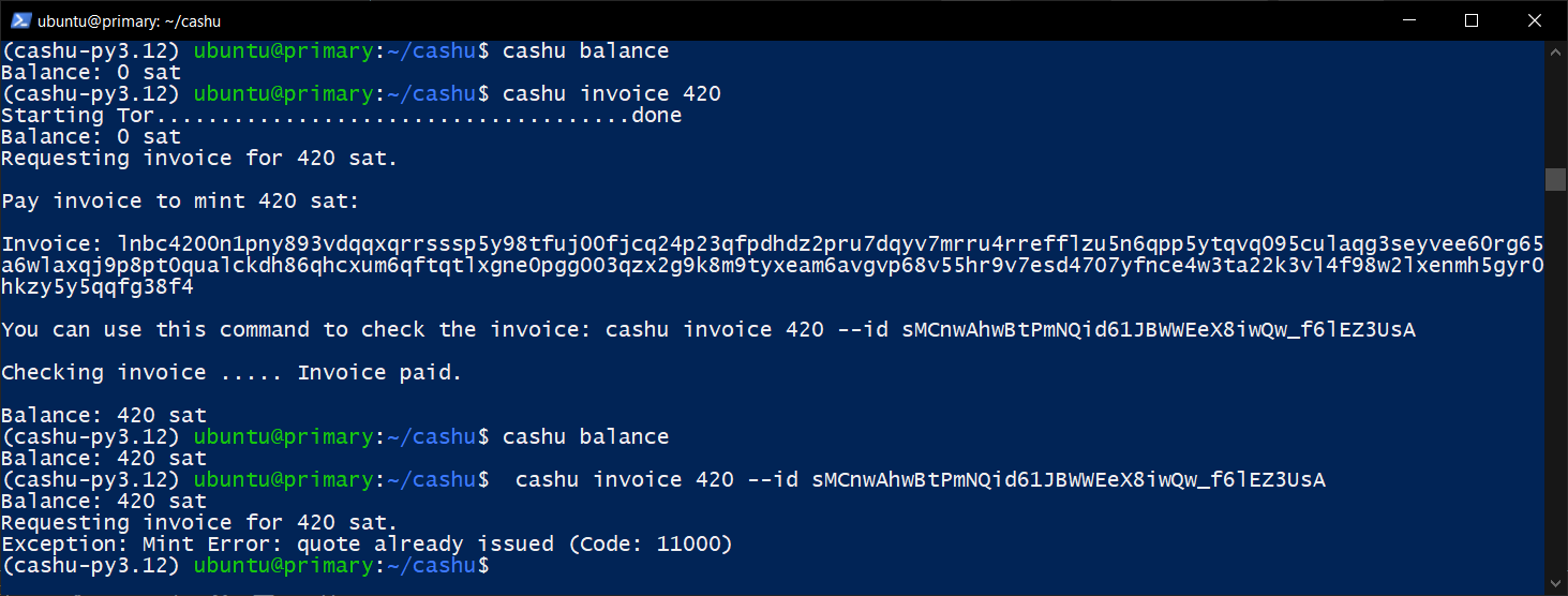 Out of curiosity I installed cashu wallet to a fresh ubuntu VM that had nothing else, with test MINT_URL=https://testnut.cashu.space as per the manual. Then I minted some coins WITHOUT PAYING THE LIGHTNING INVOICE: