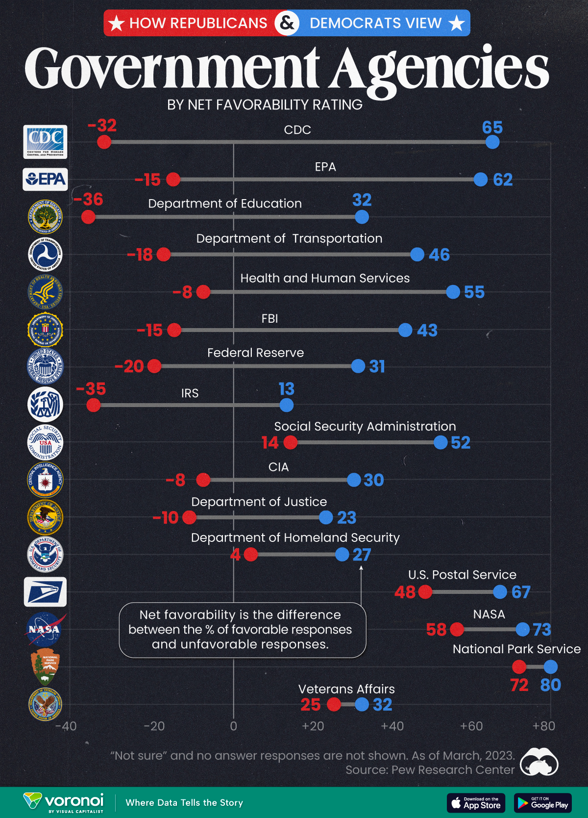 Last week, I shared a chart that shows how Americans feel about federal government agencies. This time, it's the same thing, but breaking it down by Republicans and Democrats. The results seem quite different to me, am I seeing this right?