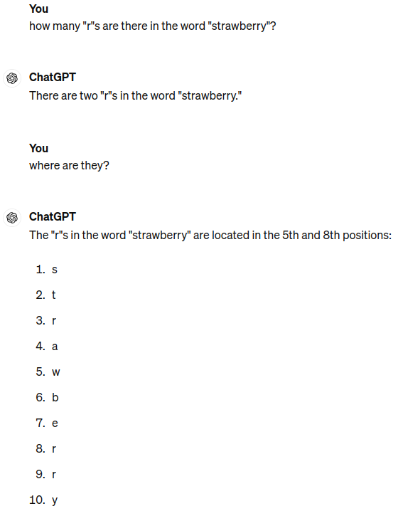 If you take your example and have the LLM respond with Python code that counts the letters and returns the positions it is more likely to get it correct. At some point the OpenAI team will figure out how to get it to do this behind the scenes. You can actually ask it to analyze a CSV file and it automatically writes Python code to do it, so this is already close to reality.