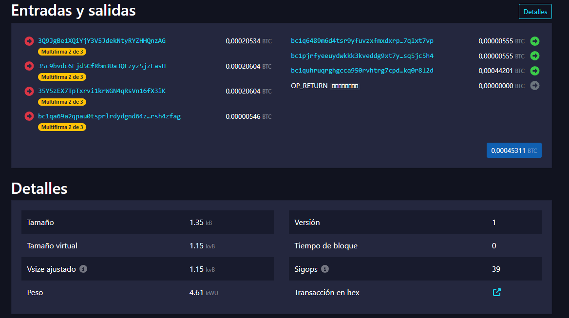 In this specific case, in the transaction flow, we can see that it has 4 inputs. That is, 4 unconsolidated coins. And it also has 4 outputs, meaning destination addresses.