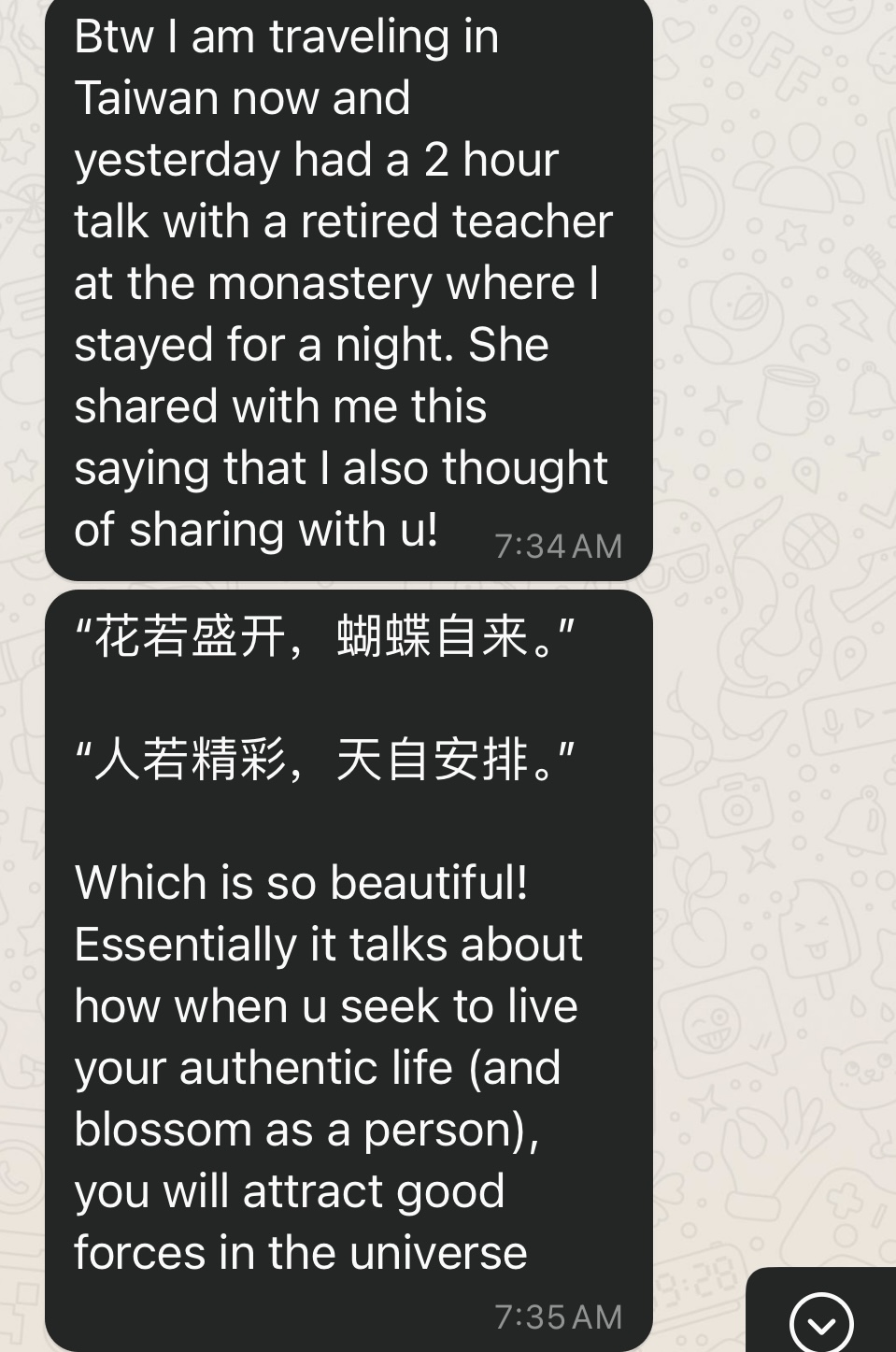 Last week, my friend messaged me because I sent her a screenshot about coping with impostor syndrome by treating one’s challenges like games to master. Turned out that she is travelling in Taiwan now. She sent me these 8 words which can be regarded as the Mandarin version of The Law of Attraction.