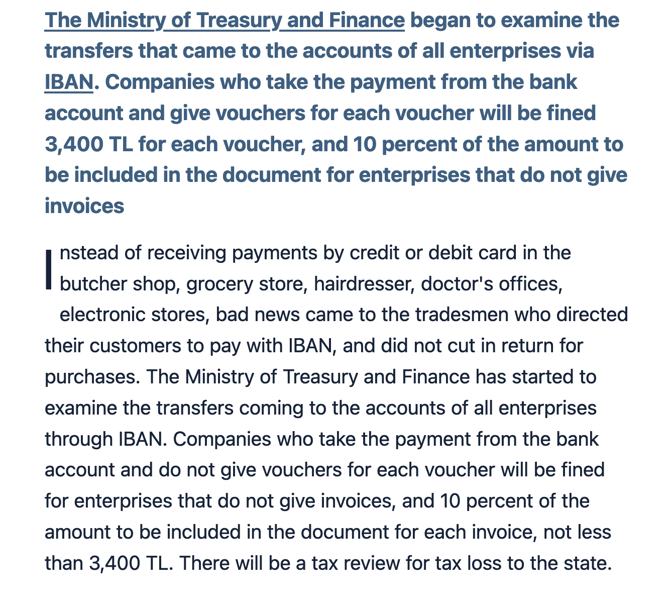 Just learned that there is a new law in Turkey saying that any business accepting direct bank transfers ( IBAN ) from customers is illegal, and would be fine if it got caught - their money their rules...