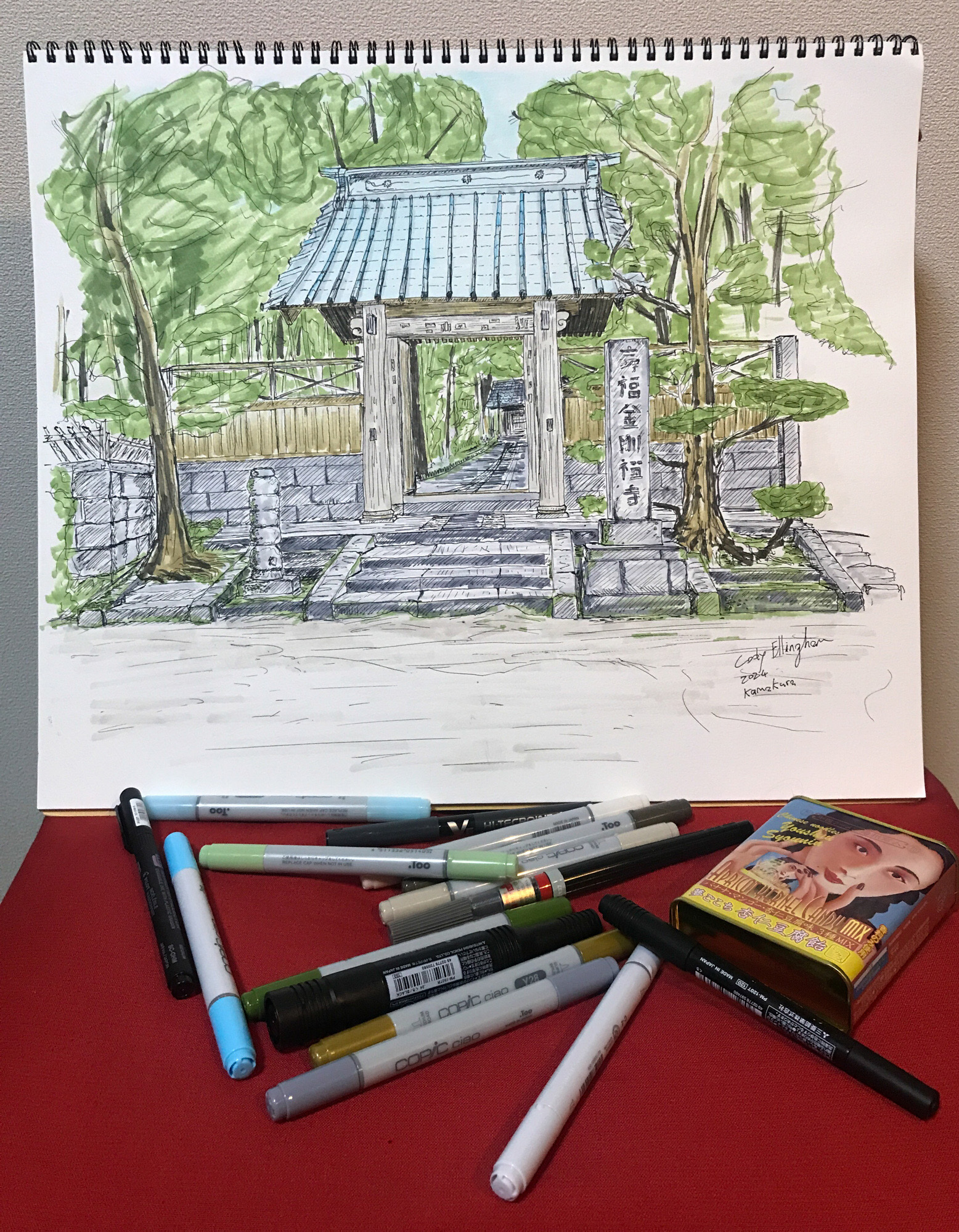 I went out on a sketching expedition with my friend today in Kamakura, Japan. We spent several hours near Jufuku-ji Temple and I fell in love with the late Spring colours.